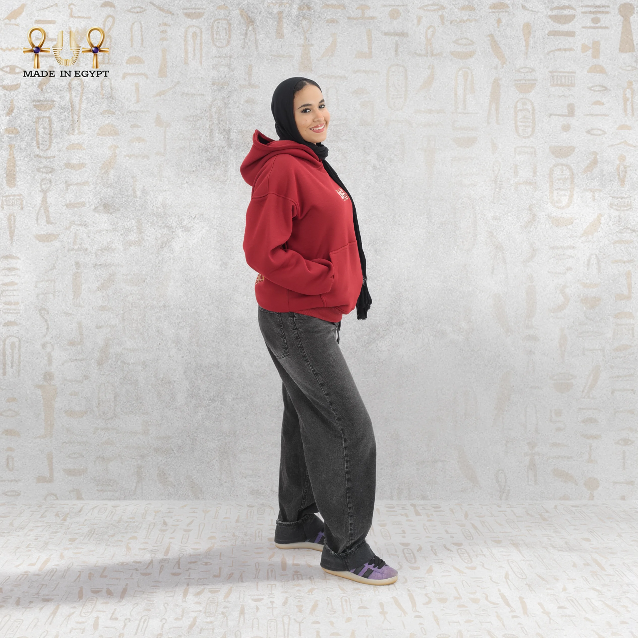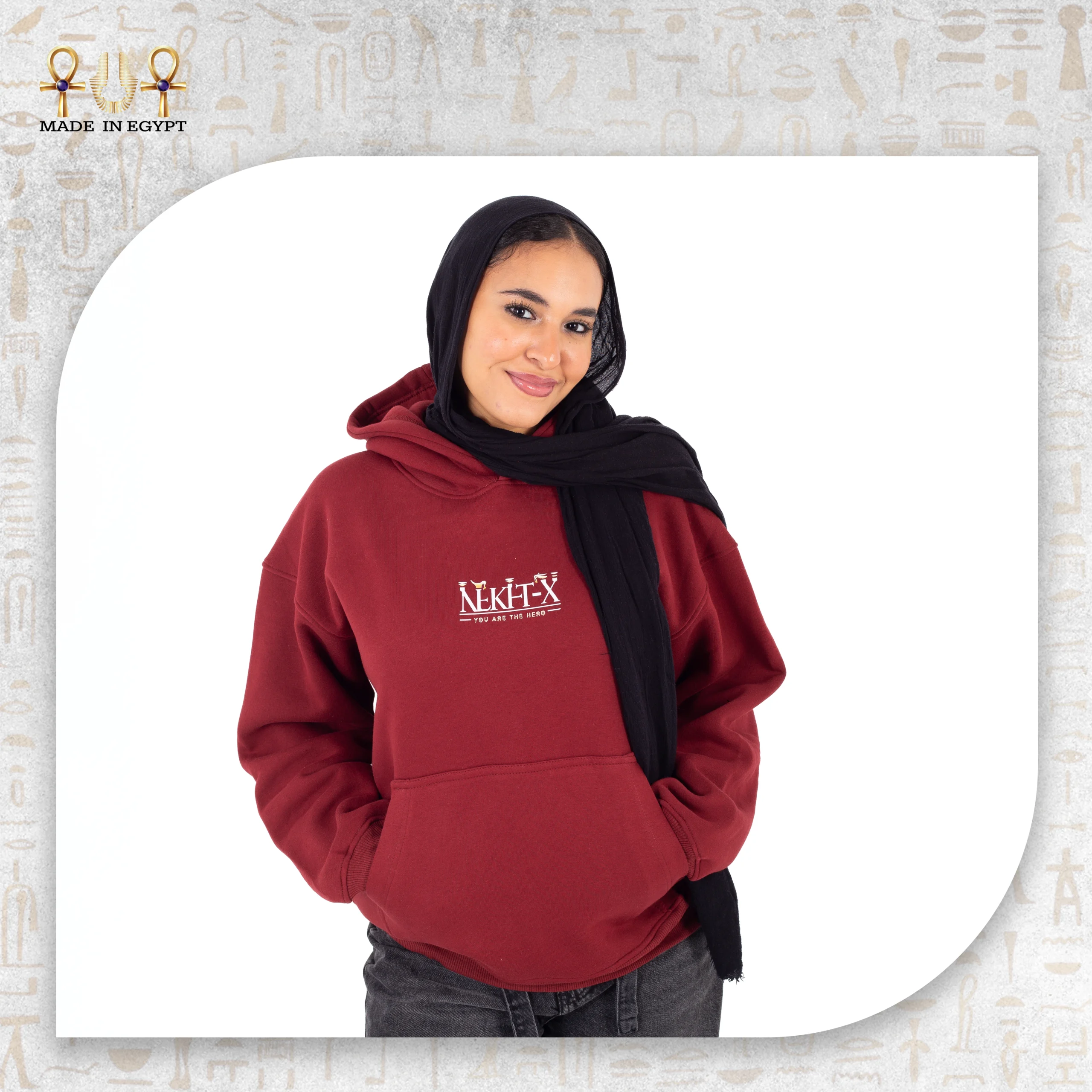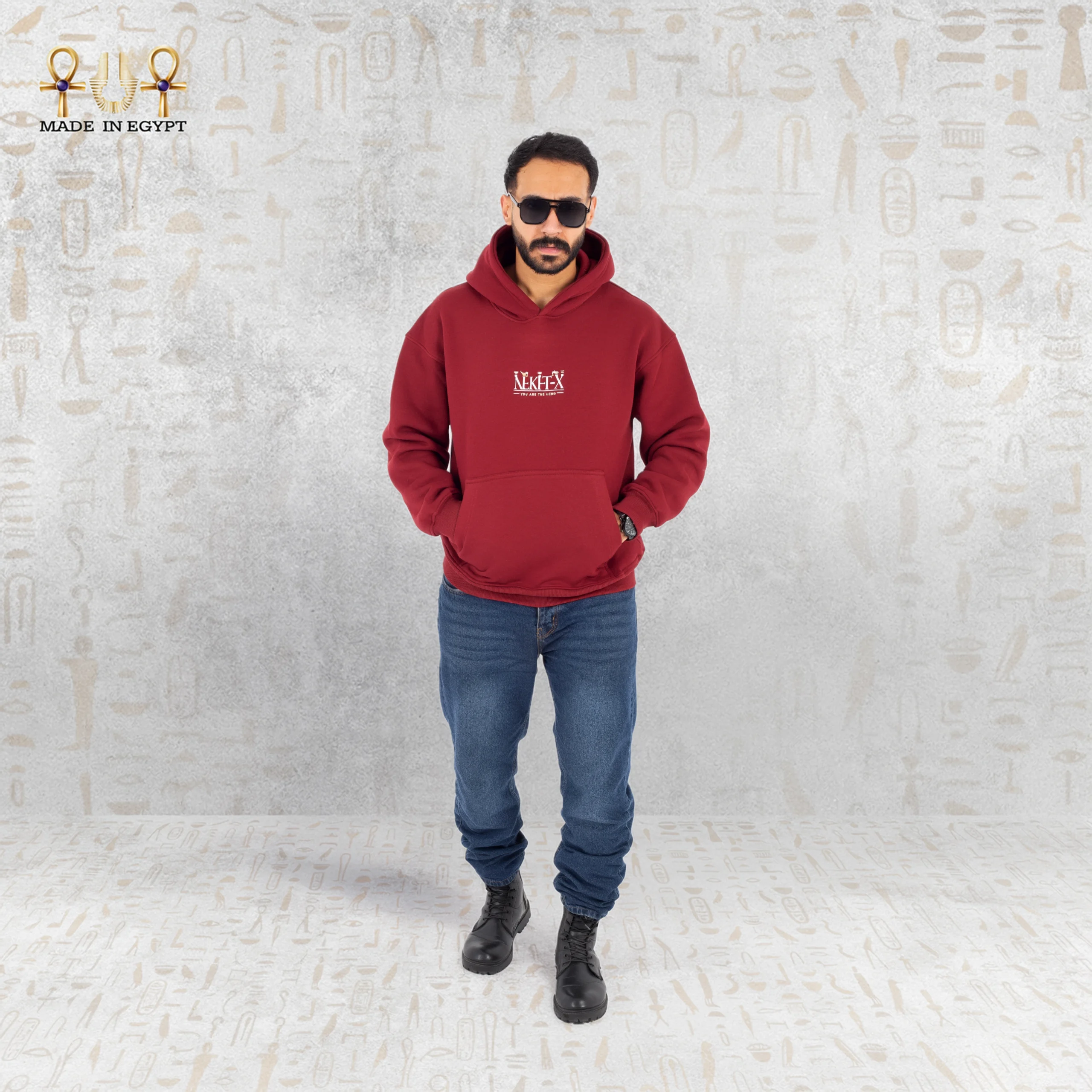 The front design remains minimal, featuring a small Pharaonic emblem on the chest. This subtle detail balances the bold back artwork. Therefore, the hoodie delivers refinement from the front and impact from behind.