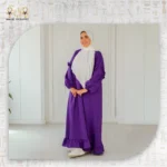 The bold purple shade radiates sophistication and complements all skin tones. Pair it with a white or cream hijab for a gentle look, or choose darker hues for contrast. Whether you’re heading to a family gathering, a casual outing, or a relaxed evening, this dress adapts effortlessly to your style.