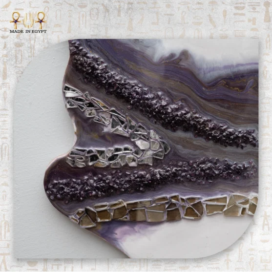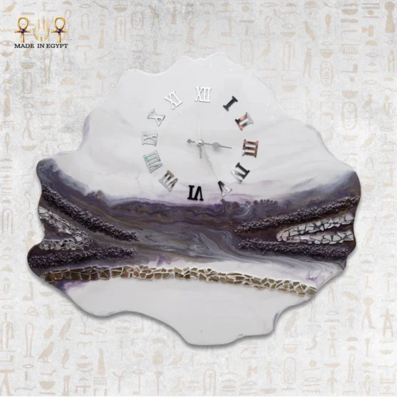 The Purple Geode Clock is an elegant handcrafted resin art piece inspired by natural geode crystals. Layers of white, grey, and deep purple resin blend seamlessly to form a realistic stone-like structure. The design mimics the organic textures and flowing lines found in real geodes.