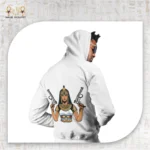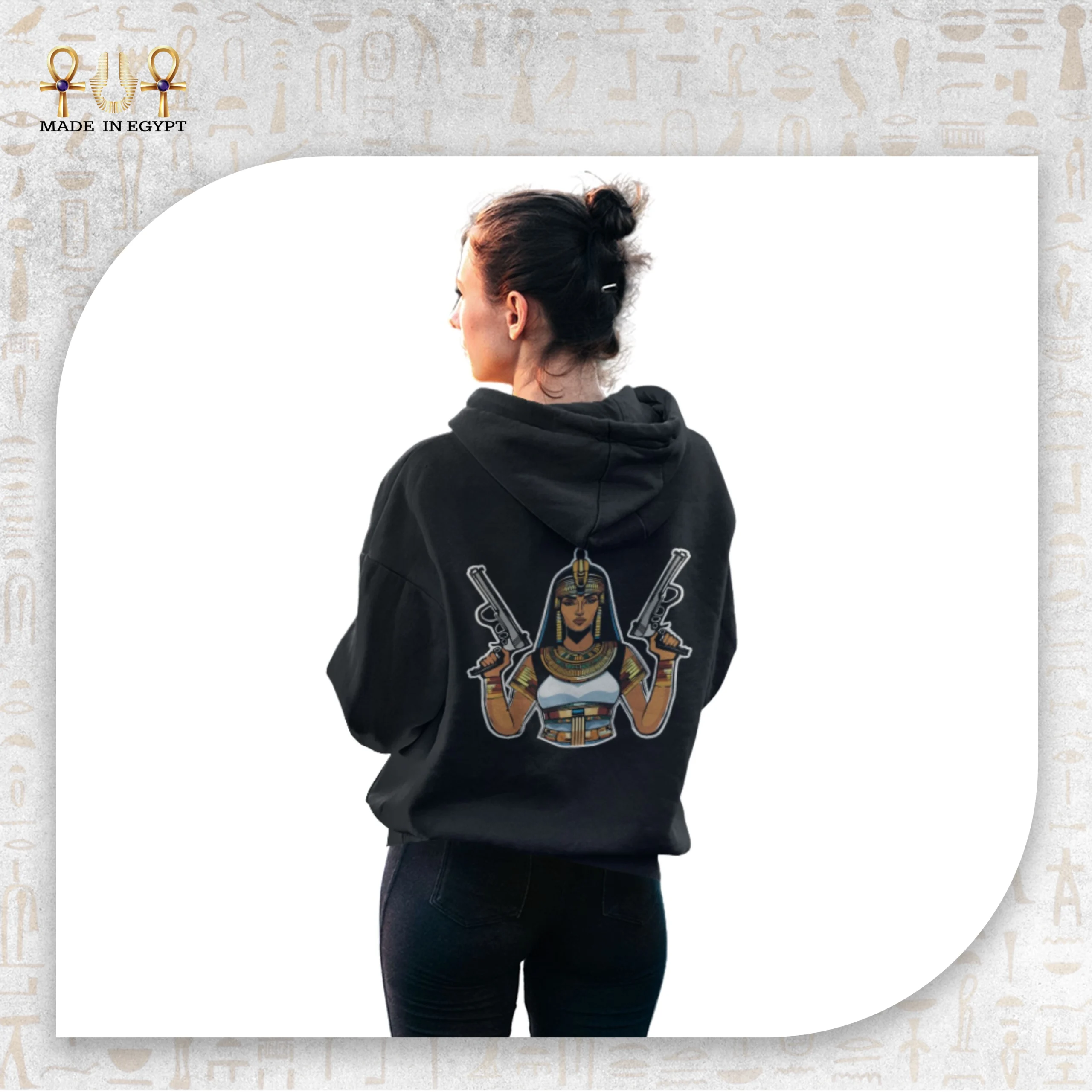 The back design showcases a fierce Egyptian queen holding two pistols — a striking scene that mixes ancient symbolism with modern attitude. The queen represents strength, rebellion, and a fearless approach to life, showing that femininity is powerful, not passive.
