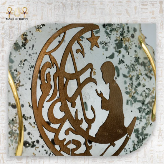 It is a handcrafted piece that combines spiritual elegance with modern artistic design. This tray features a wavy-edge shape and a golden engraving of a praying child sitting on a crescent moon, symbolizing the calm and meaningful essence of Ramadan. Every detail reflects careful craftsmanship and cultural significance, making it both functional and decorative.