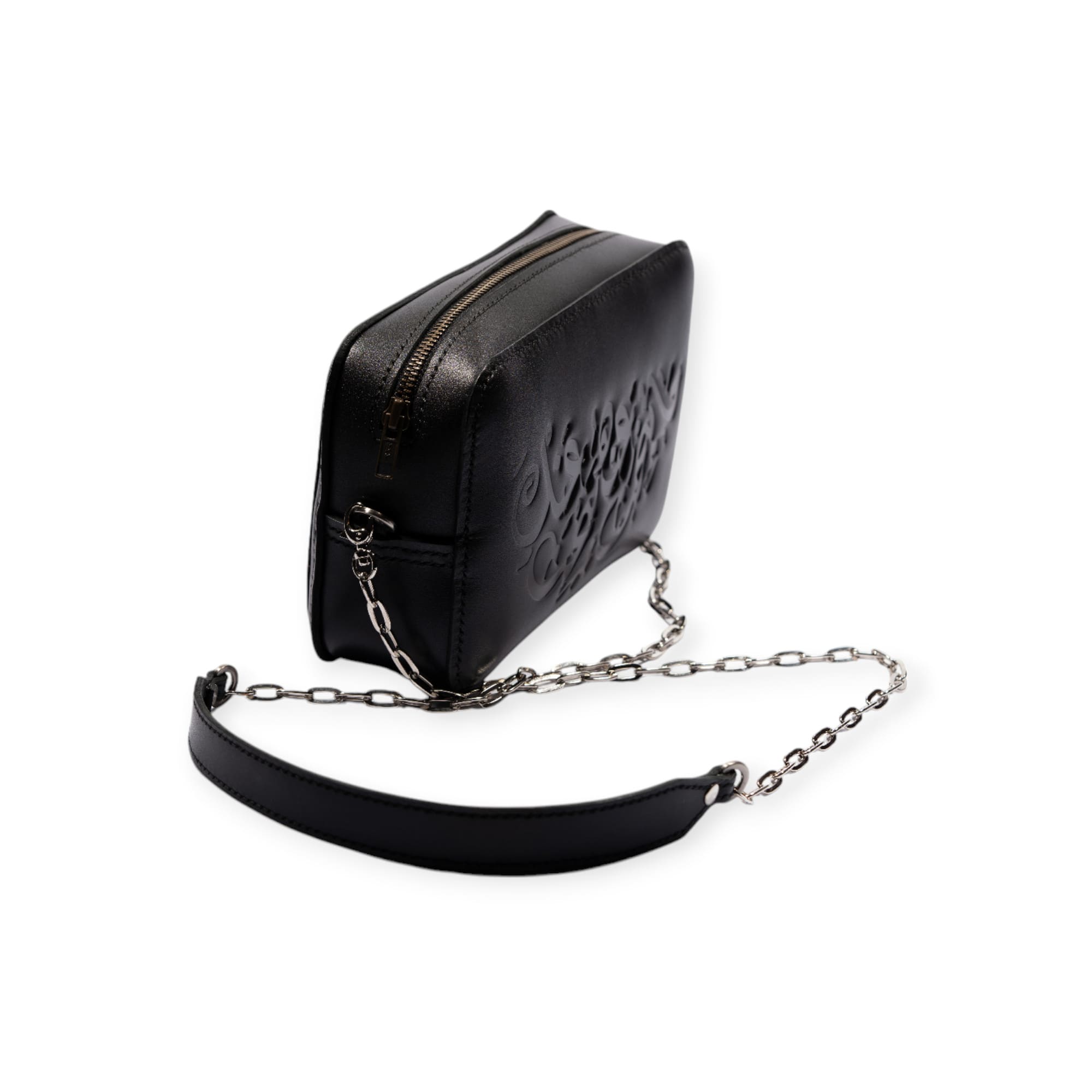Front view of black leather rectangle crossbody bag with embossed Arabic calligraphy design and silver chain strap.