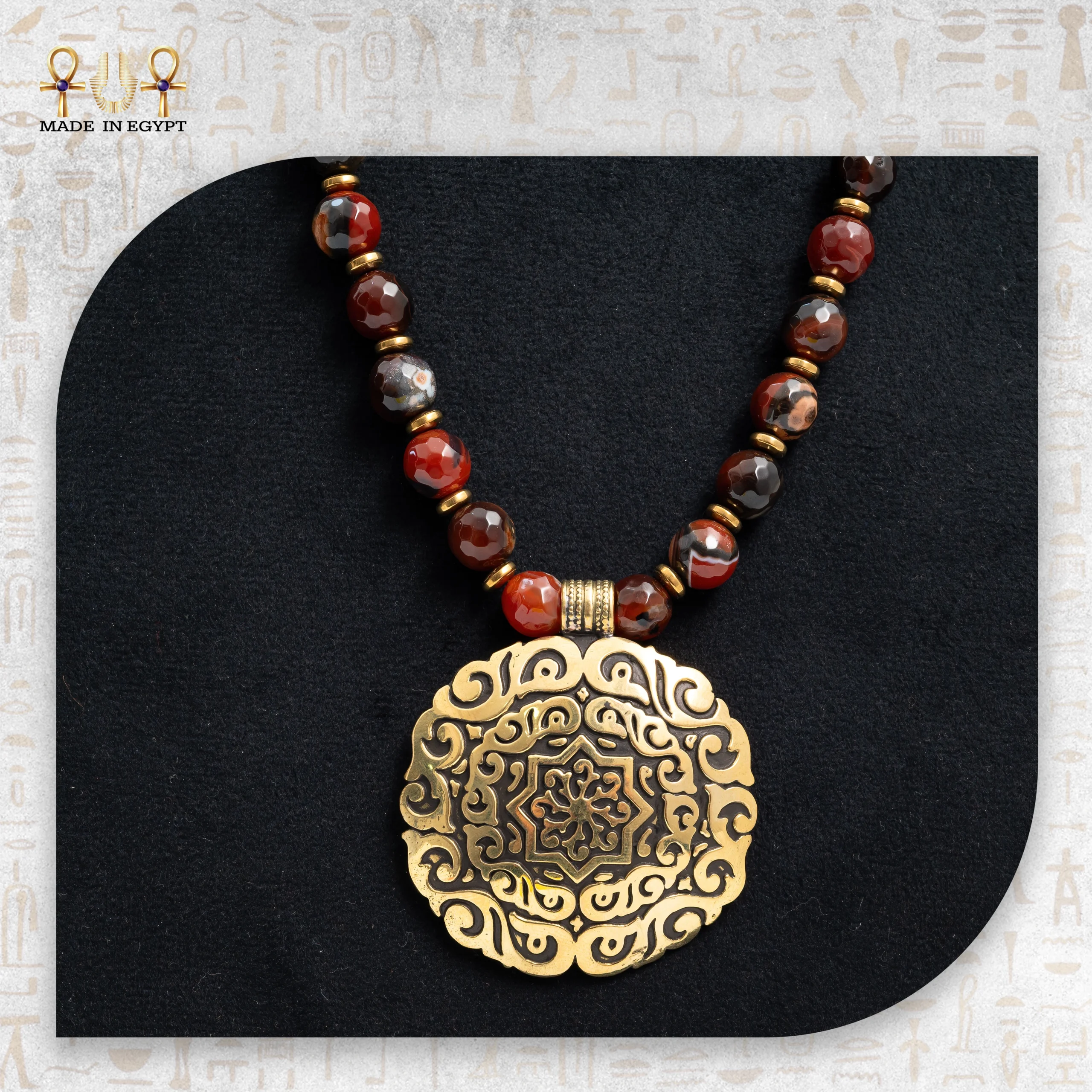 A striking handcrafted necklace featuring a pure brass engraved pendant paired with natural red agate beads. Its rich earthy tones and oriental detailing create a bold, elegant statement that adds warmth, character, and heritage to any look.