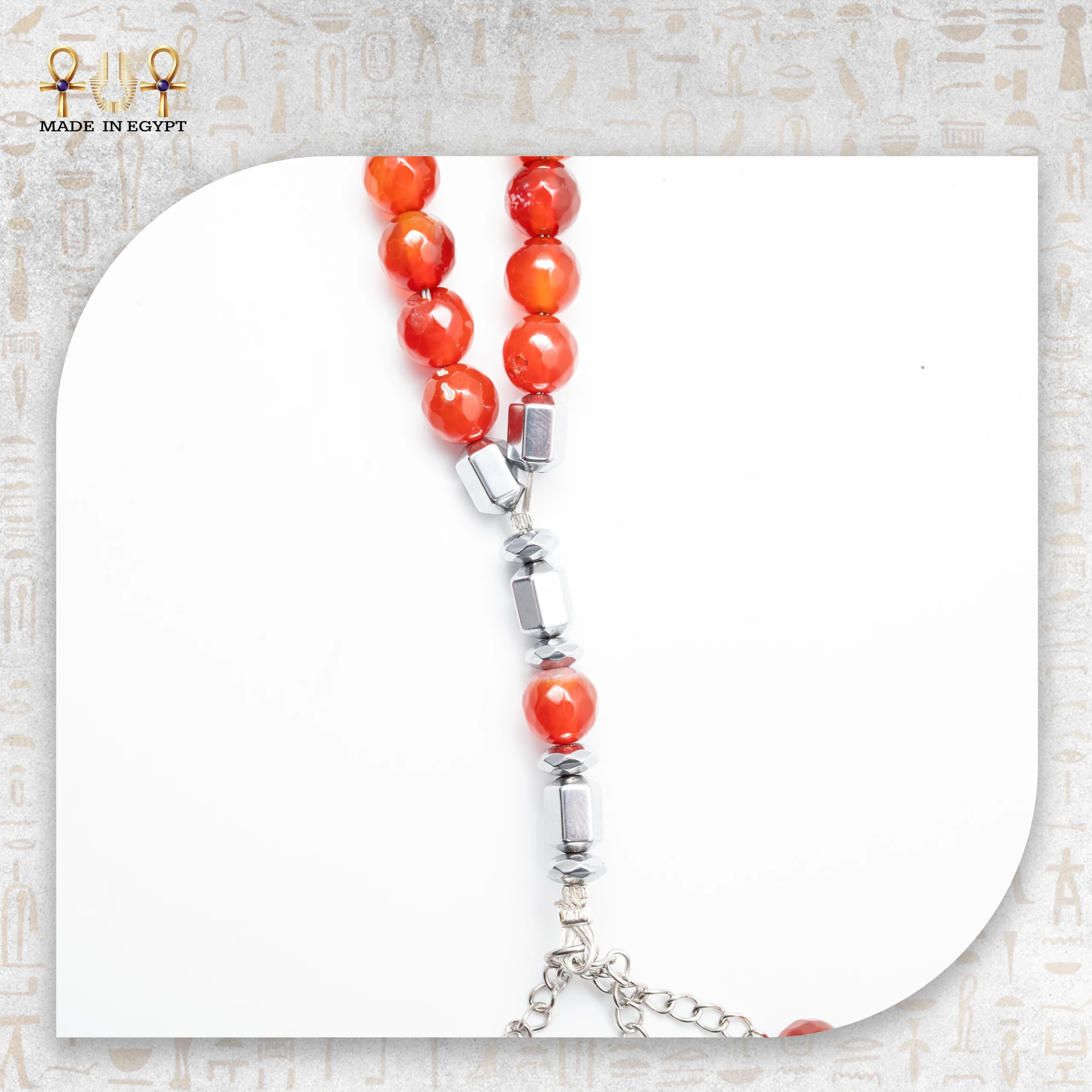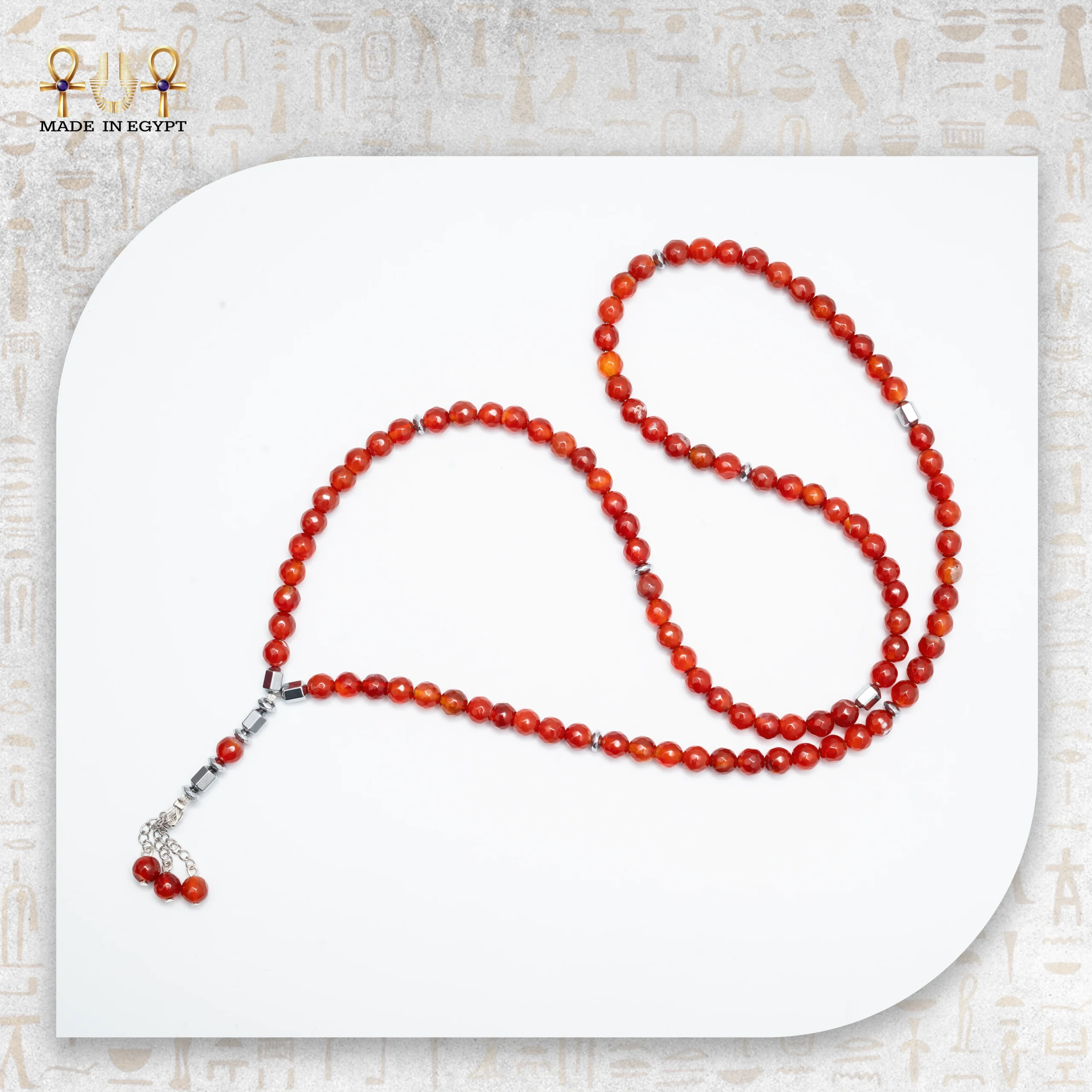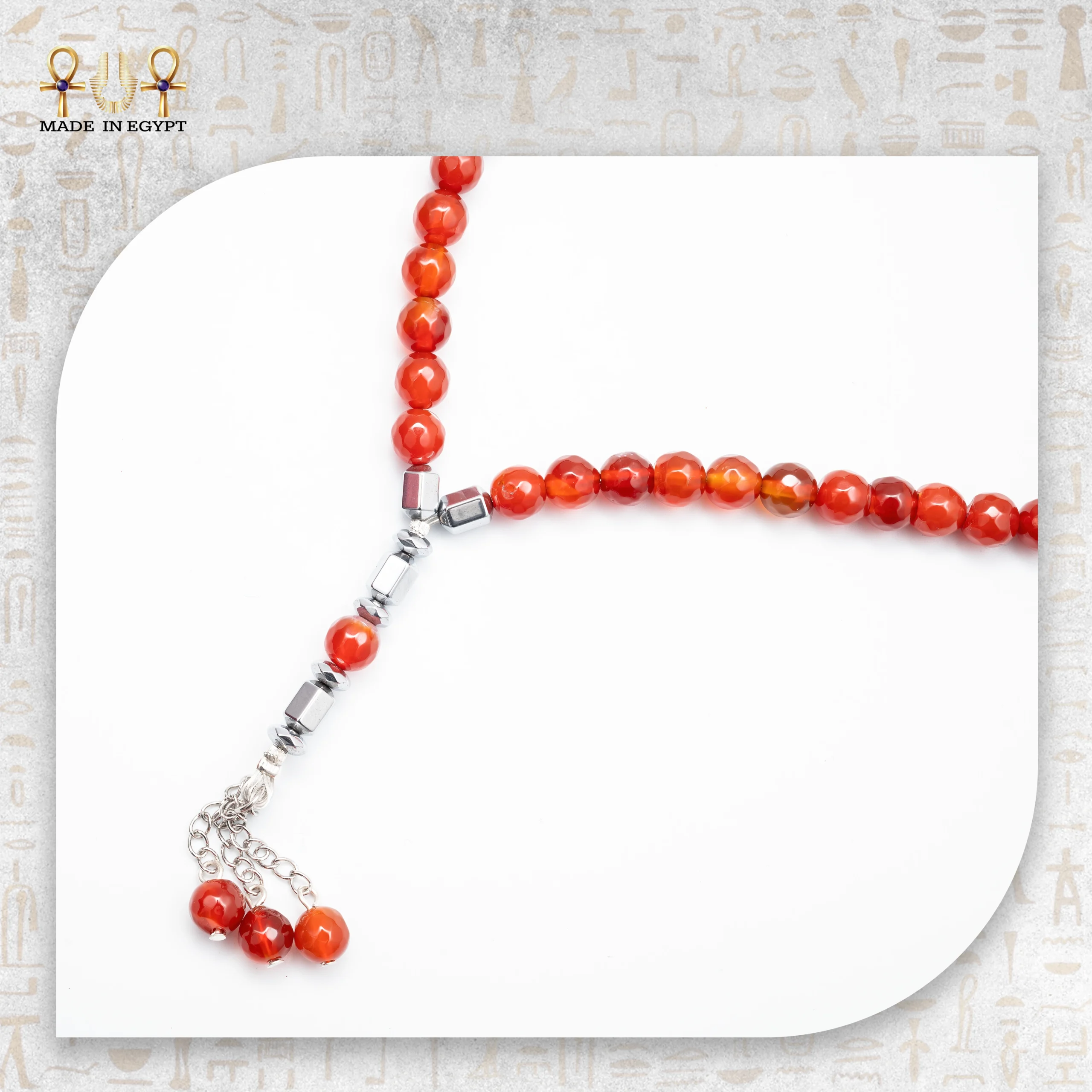 At the end of the misbaha, the tassel design includes smaller red agate beads arranged with precision. As a result, the piece gains a graceful and luxurious finish. With every gentle movement, the beads reflect light and reveal their natural shine, adding depth and character.