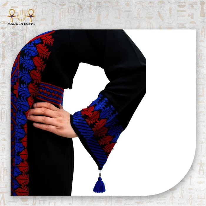 The Roots Abaya is a complete artistic piece that embodies authentic heritage in a contemporary design. From the first glance, its bold contrast of deep black with red and blue geometric embroidery captures attention. This abaya tells a story through threads, reflecting Eastern culture and the beauty of handcrafted details.