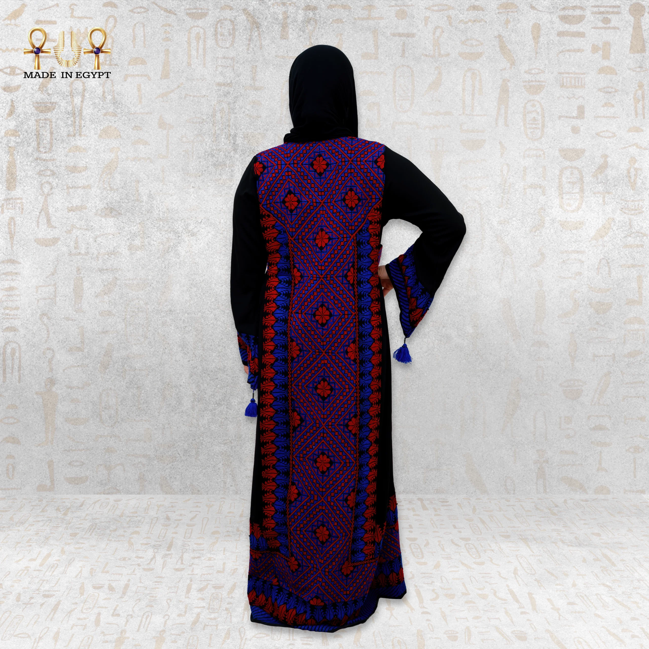 An elegant abaya that blends authenticity and heritage with a distinctive modern spirit. Designed in a refined black tone, it is adorned with geometric hand embroidery in red and blue, inspired by traditional heritage motifs.