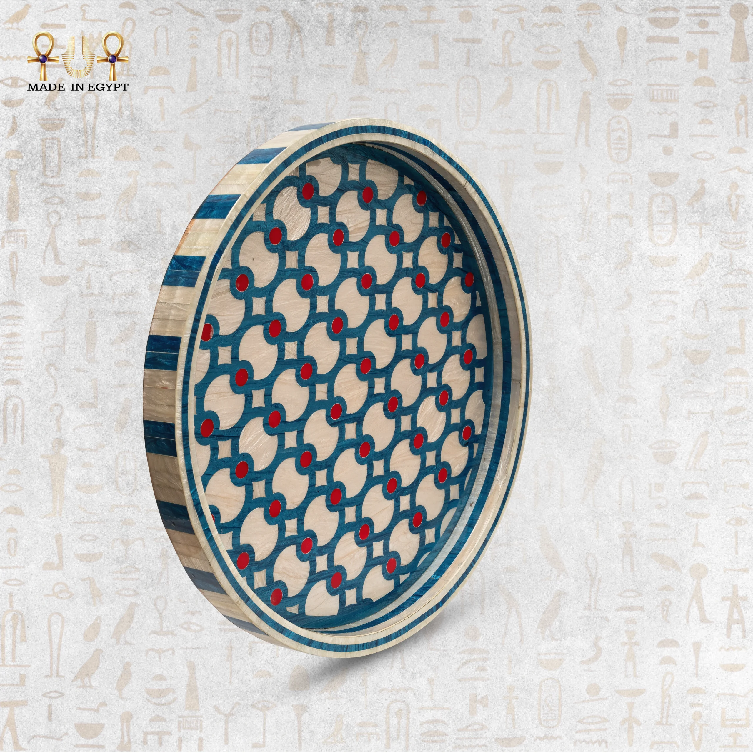A handcrafted round serving tray made of wood and inlaid with synthetic mother-of-pearl in elegant artistic patterns. A premium, labor-intensive piece ideal for serving or home décor.