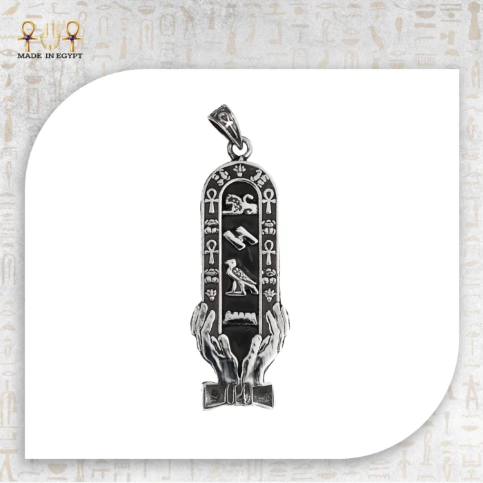 The timeless cartouche design — once used to protect royal names — now becomes a symbol of personal empowerment and protection for the wearer. The raised hands on each side add a unique touch to the design, echoing ancient gestures of offering and blessing.