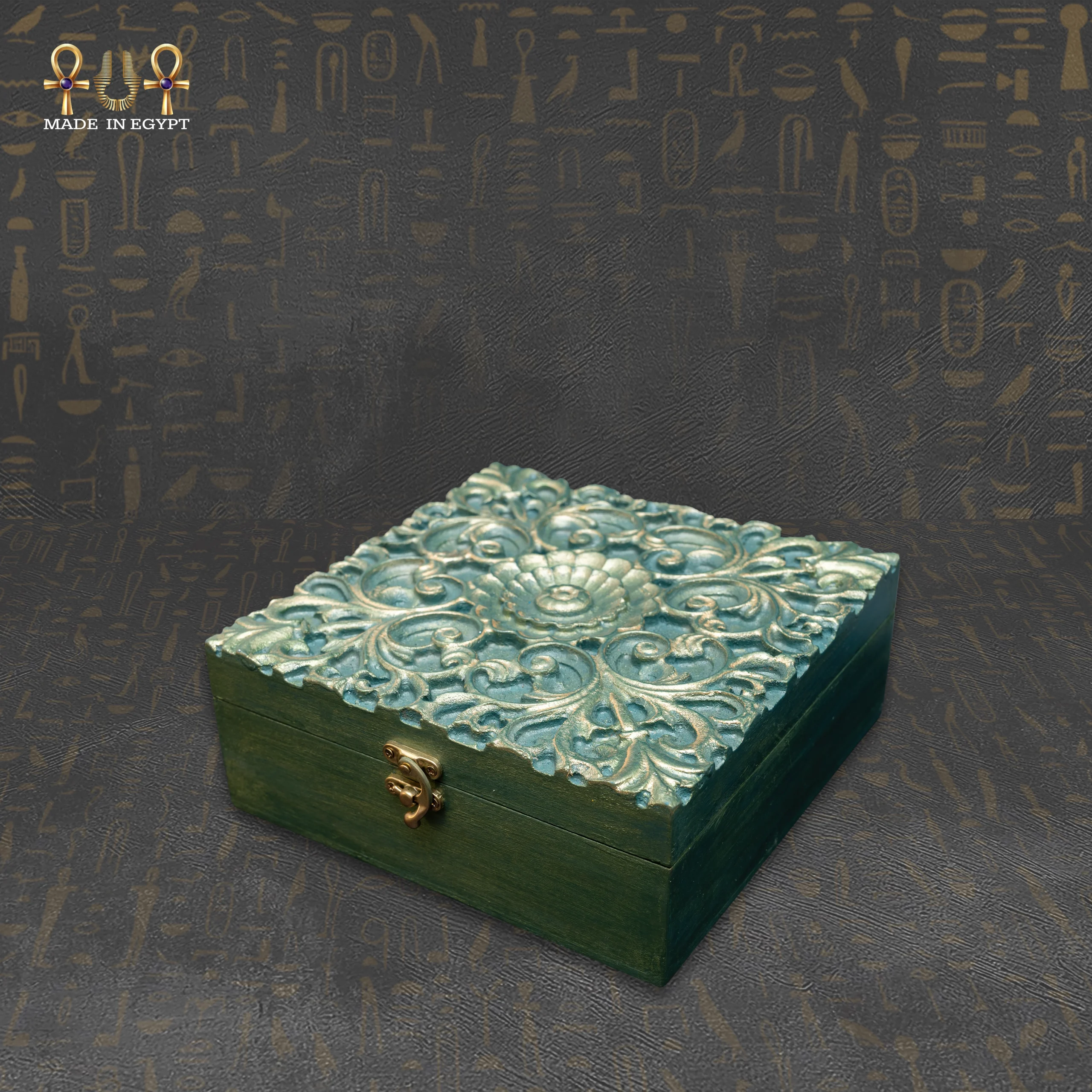 Crafted from high-quality MDF wood, this square jewelry box offers durability and long-lasting strength. The lid showcases raised classical carvings inspired by refined ornamental patterns, adding luxurious artistic detail. Its antique olive green finish creates a warm, timeless look that perfectly balances heritage charm with modern sophistication.