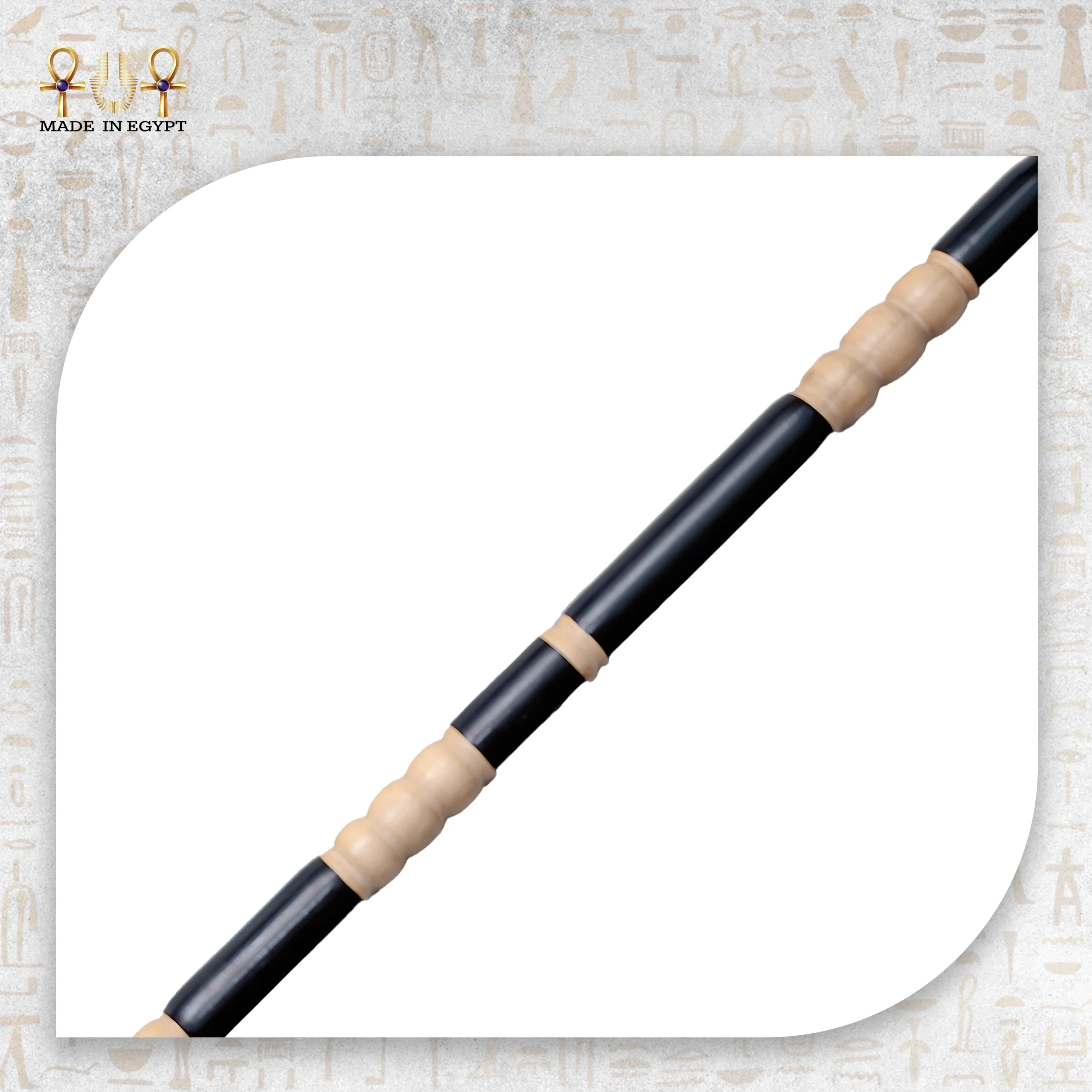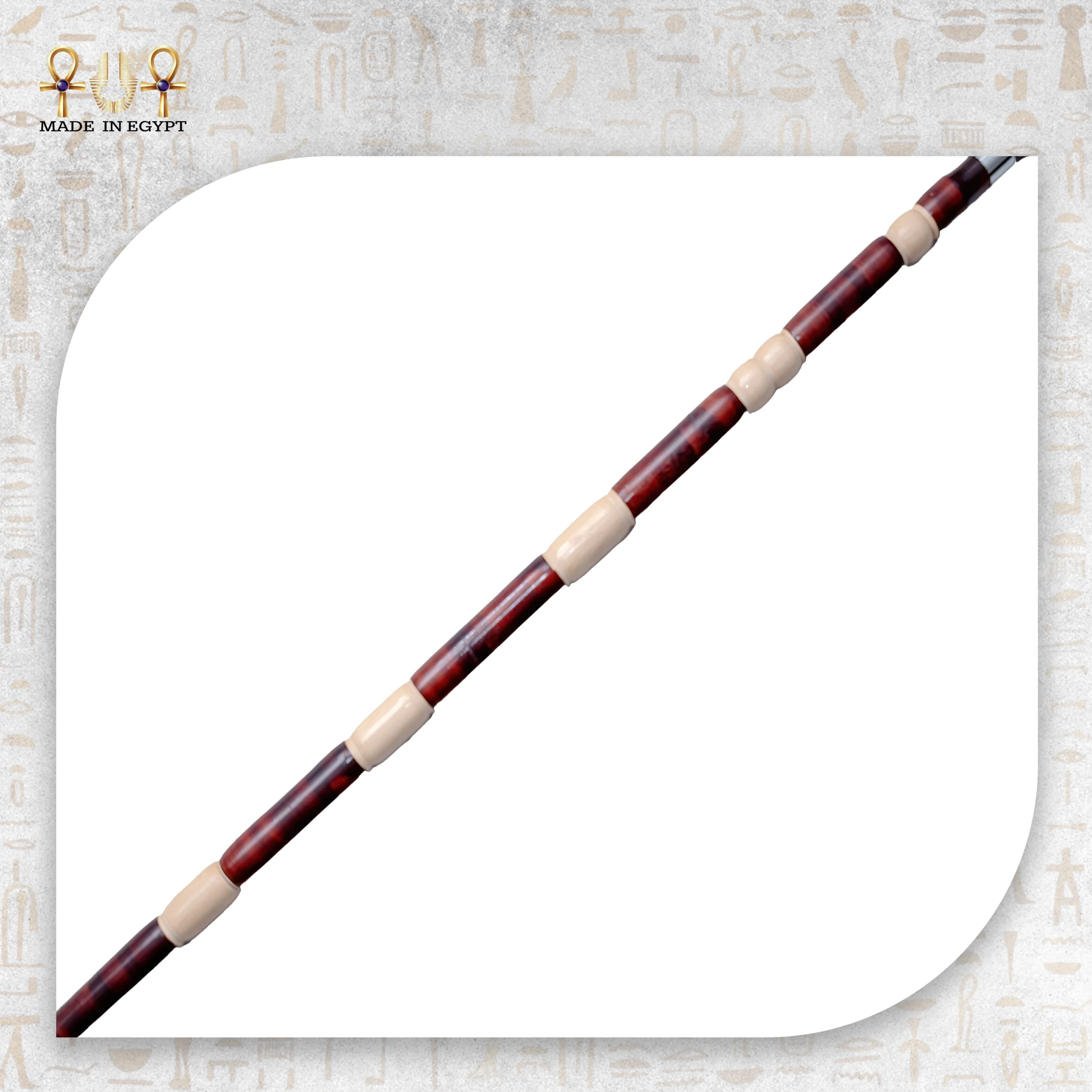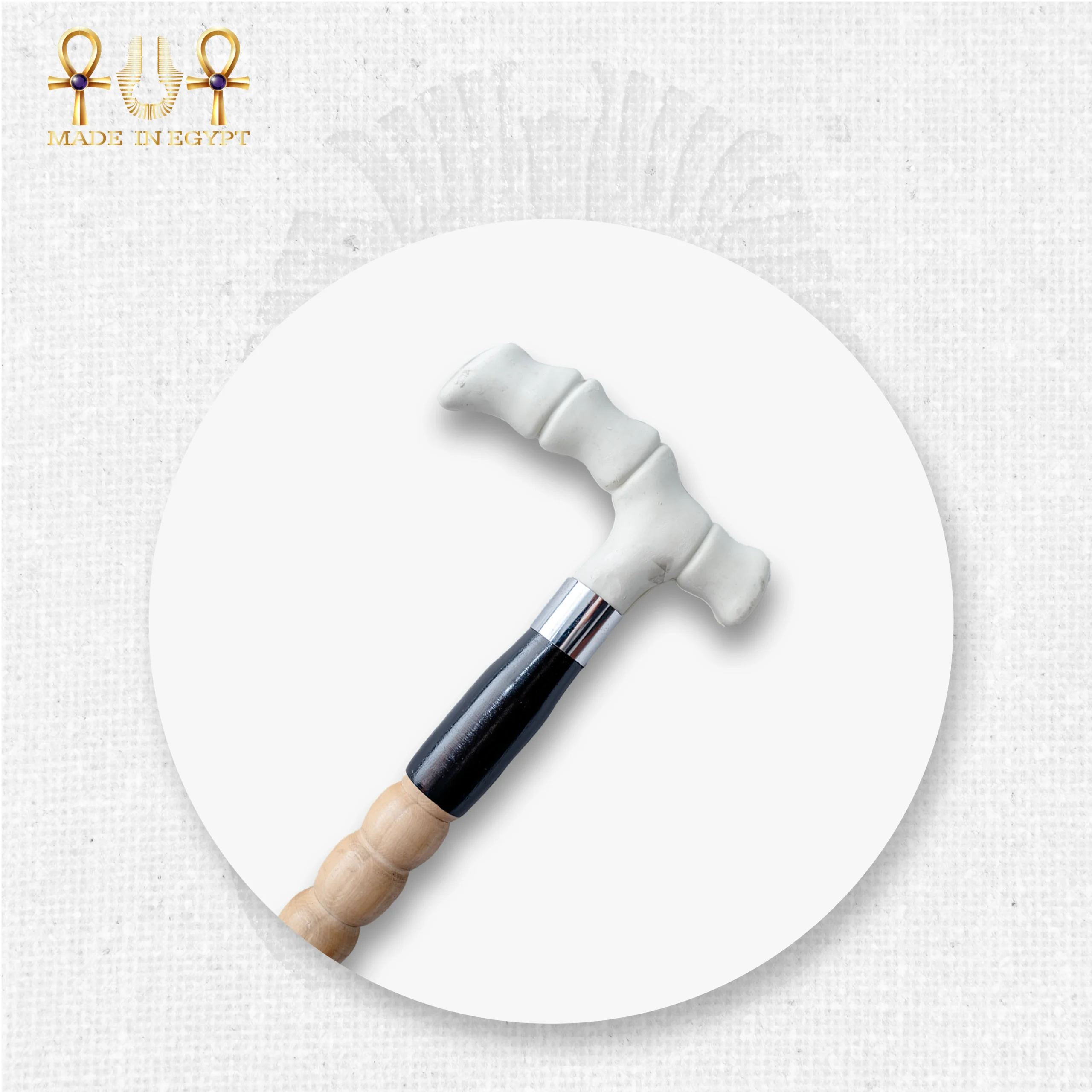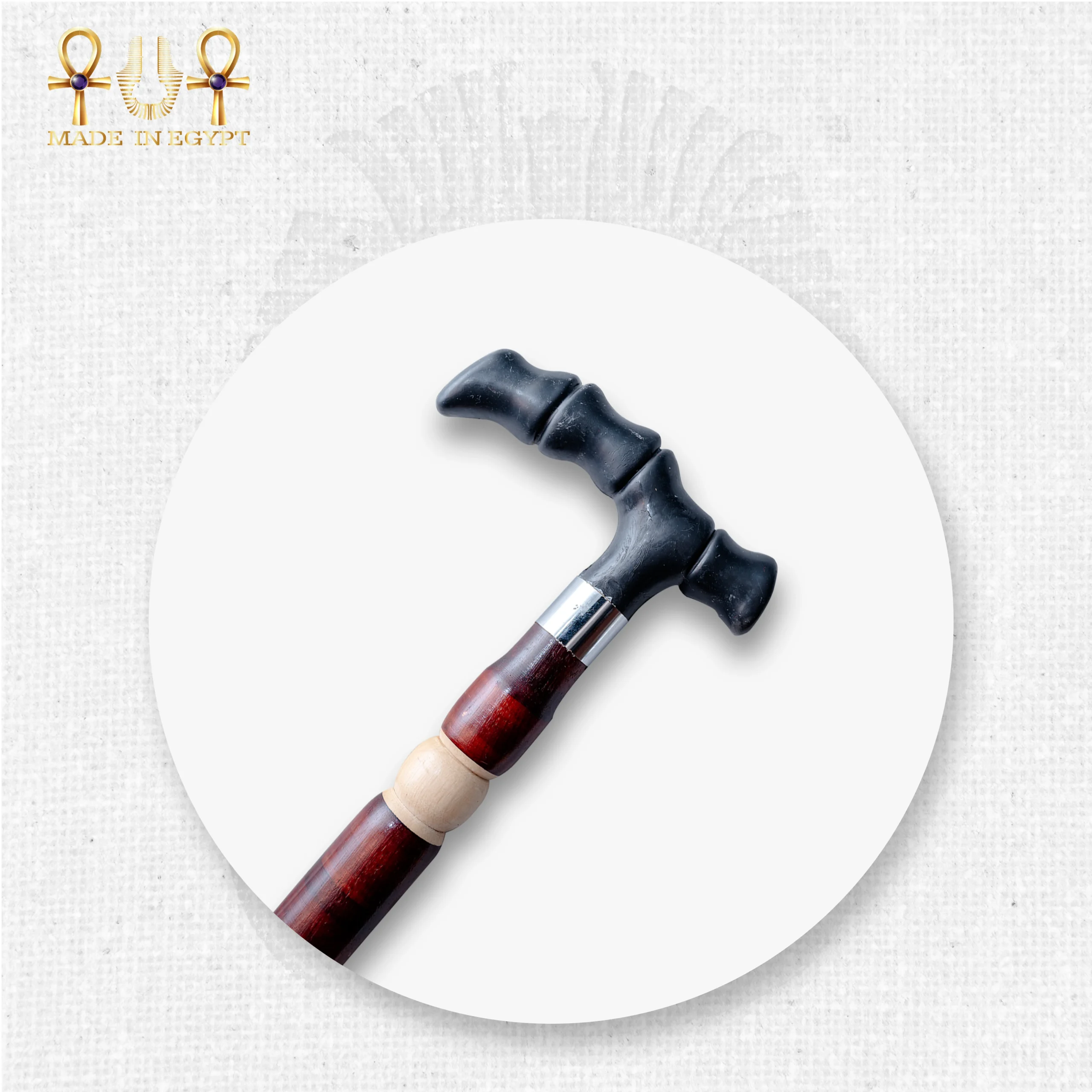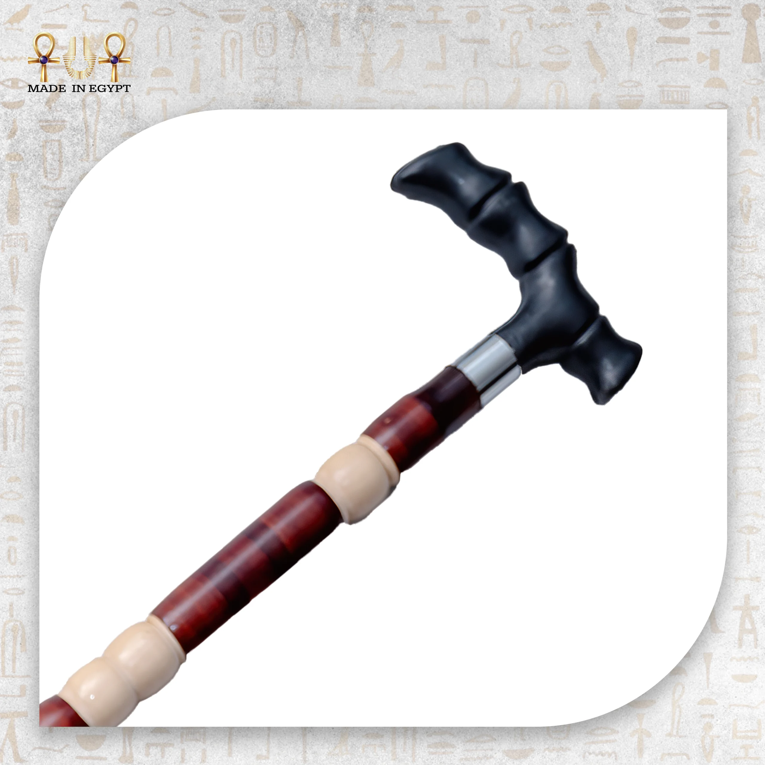 Every inch of this cane is carefully carved and polished by Egyptian artisans. The smooth wooden surface highlights intricate natural patterns, while the ergonomically curved handle ensures comfort and balance with every step. A fine metallic ring connects the handle and shaft, adding a subtle sheen that enhances its royal appearance.
