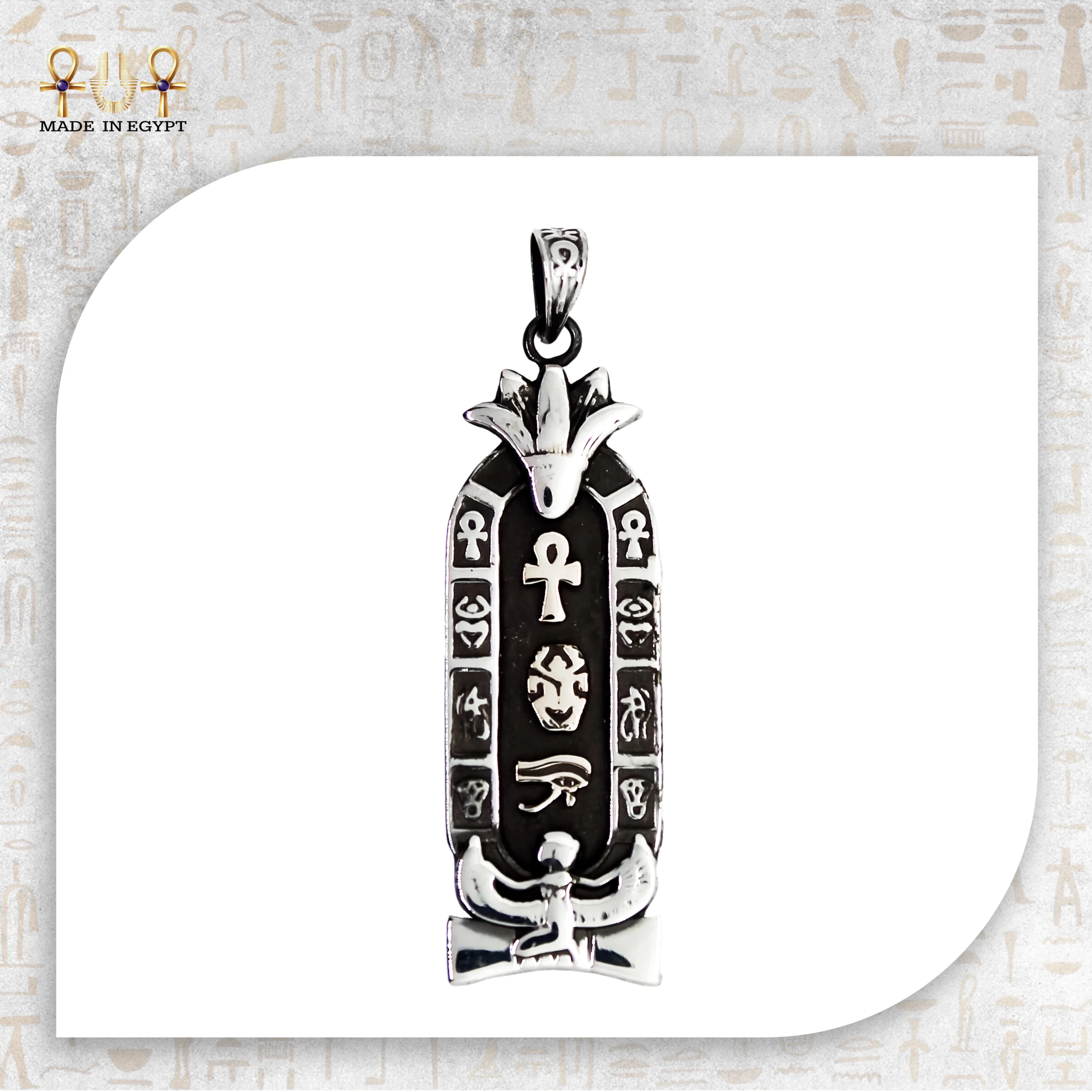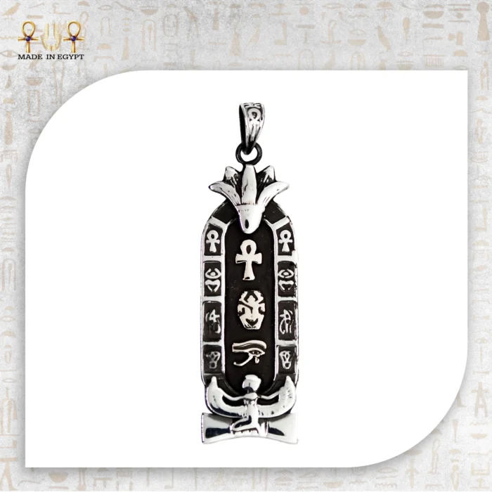 The Royal Pharaohs Cartouche Pendant pays tribute to the grandeur of ancient Egypt. Designed in the shape of a royal cartouche, this pendant brings together sacred symbols of life, protection, and divine power.