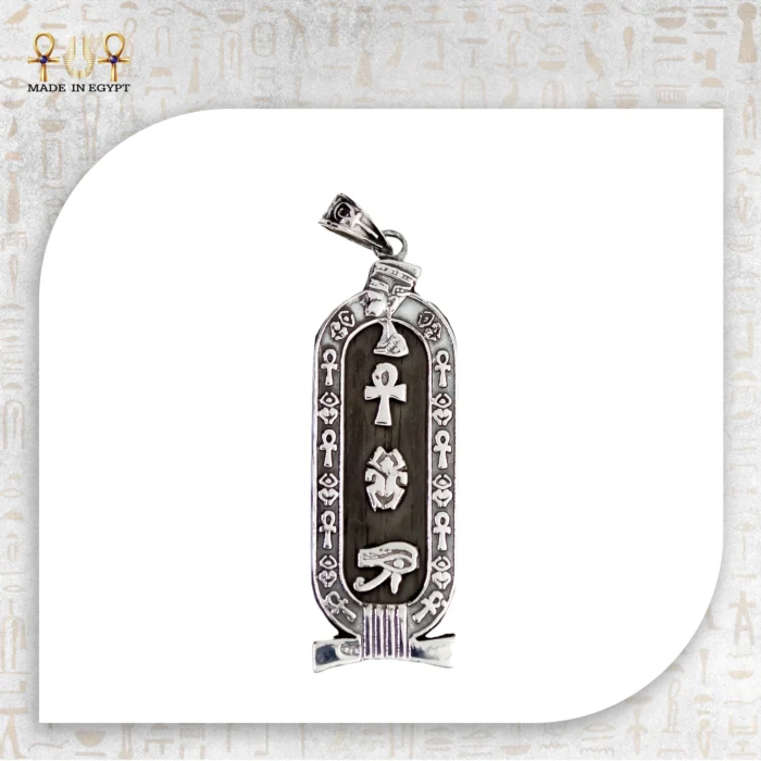 The pendant’s polished silver frame sits over a deep black enamel background, creating a dramatic contrast reminiscent of temple artifacts and royal jewelry. A border of miniature Ankh emblems surrounds the cartouche, reinforcing its purpose as a shield of divine energy and eternal life.