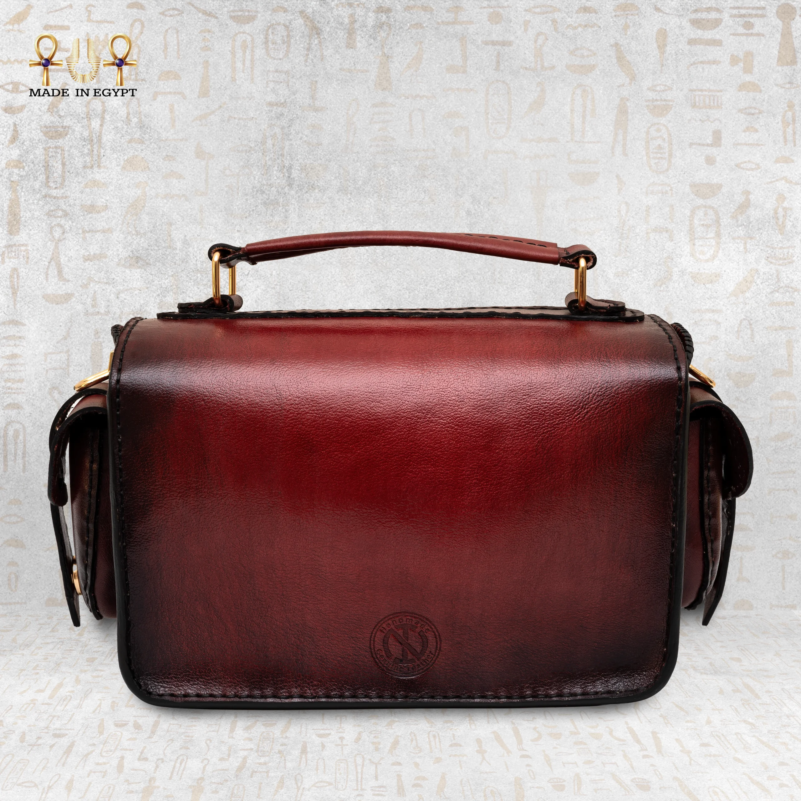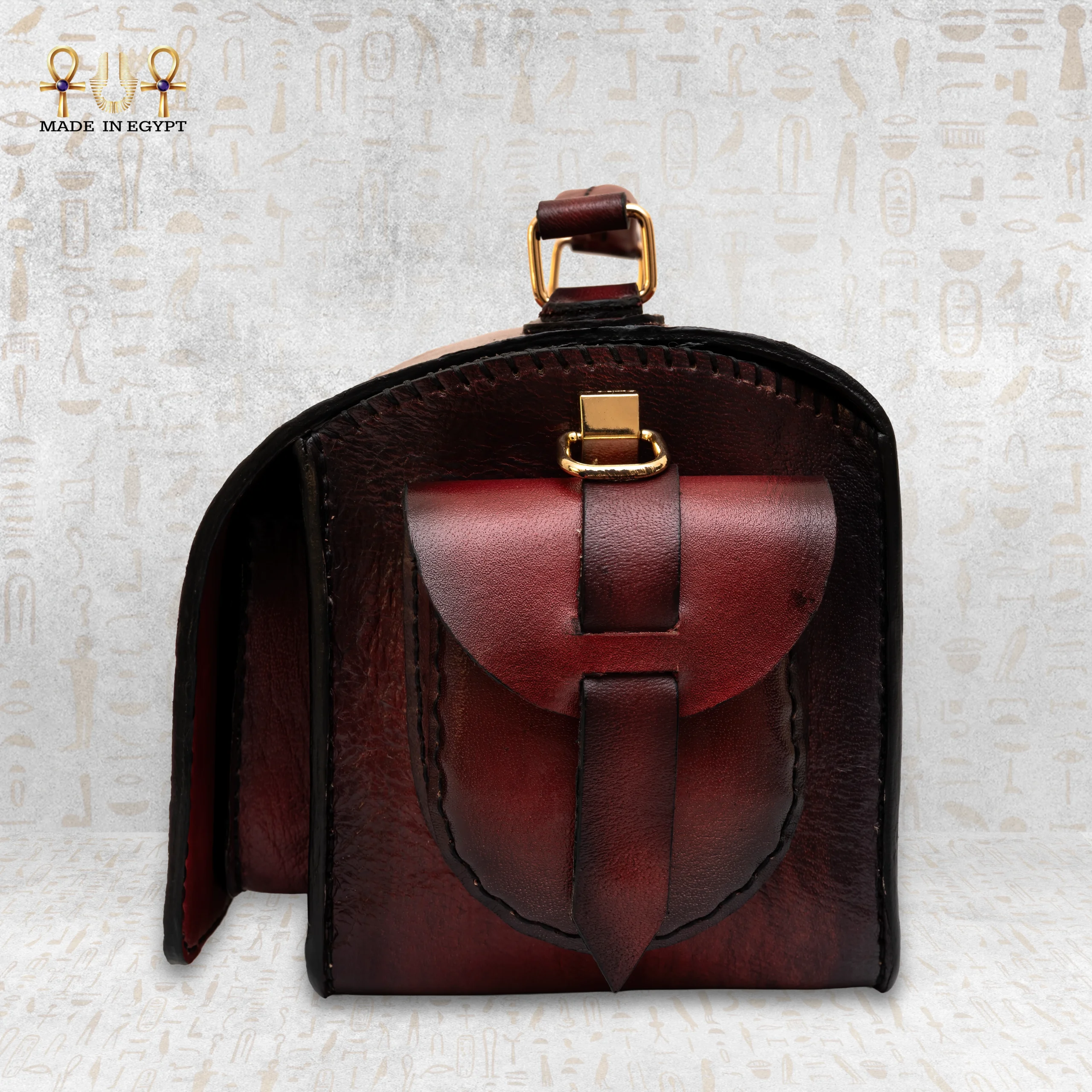 The Royal Vintage Leather Bag tells a timeless story of true Egyptian craftsmanship. Skilled artisans handcraft each bag with passion and precision. They use premium natural cowhide leather to achieve durability, authenticity, and classic elegance. The deep vintage burgundy color and aged texture highlight the beauty of antique leatherwork.
