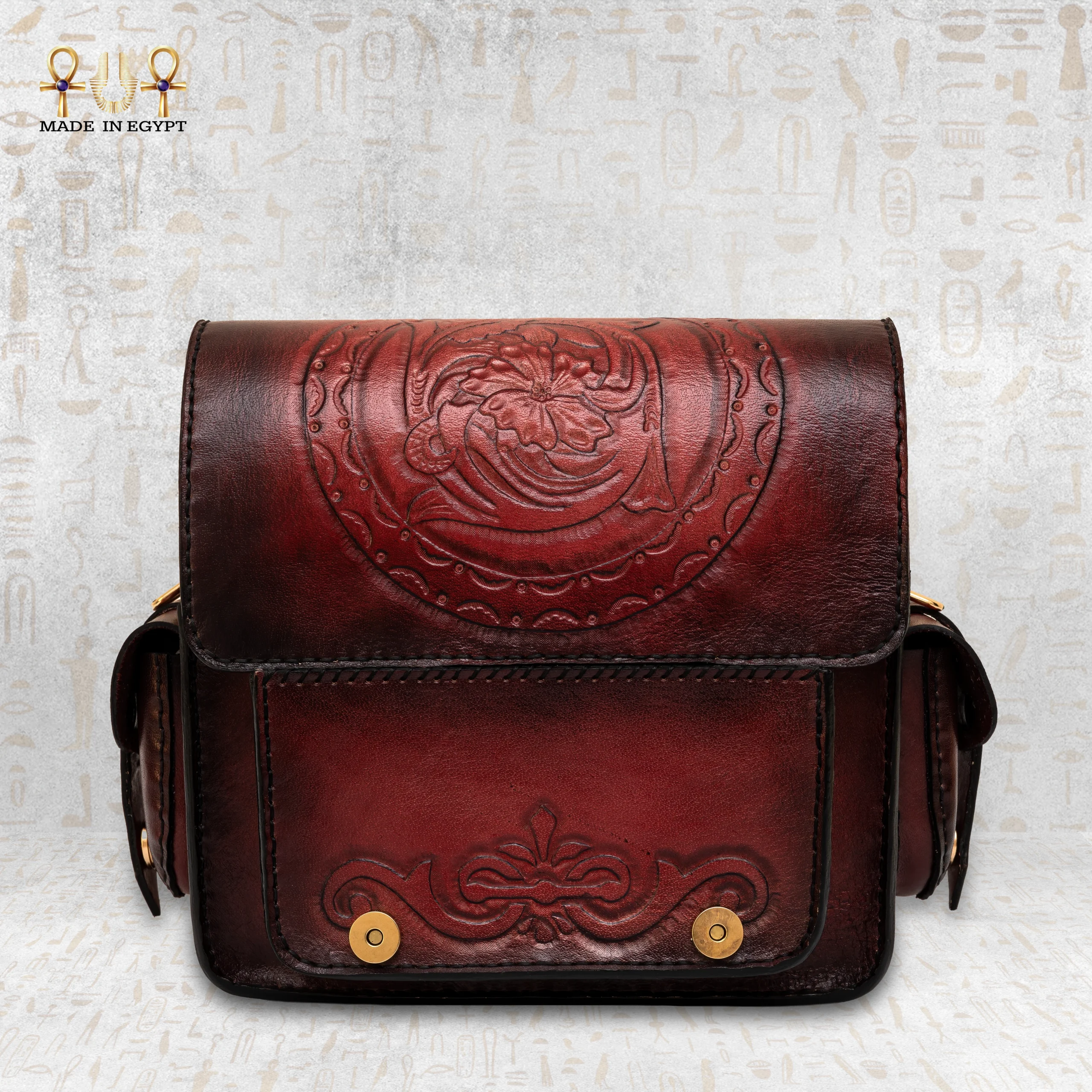 A handcrafted vintage leather bag made from natural cowhide with hand-engraved details, soft sheepskin lining, side pockets, and an adjustable strap. A timeless piece of elegance and craftsmanship.