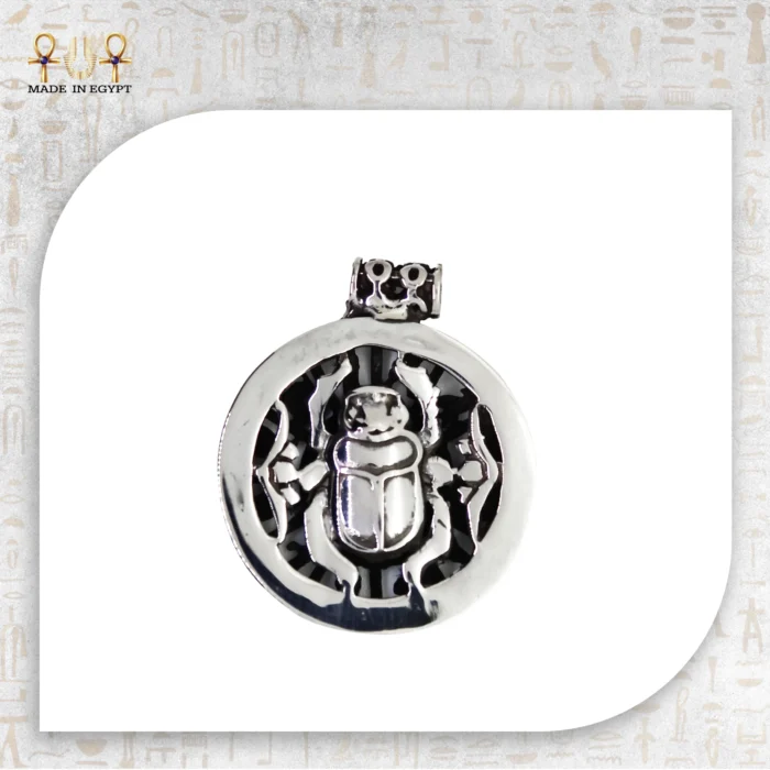 The pendant features a circular frame, representing unity and the endless cycle of life. At the center, the scarab stands as a powerful symbol of resilience. Surrounding it are symmetrical carvings inspired by temple art, showing harmony between heaven and earth.