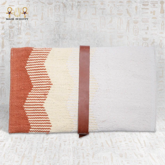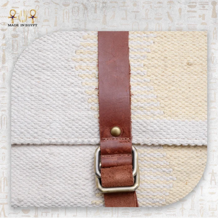 Each Sand & Leather Harmony Clutch is meticulously handcrafted by Egyptian artisans who combine patience with skill. They weave soft cotton threads in gentle ivory and beige tones, creating a texture that mirrors the calm rhythm of desert sands. The process, rooted in tradition, transforms natural materials into a refined piece of modern artistry. Furthermore, the deep brown leather strap introduces contrast and structure, symbolizing grounding and durability in design.