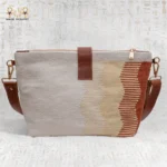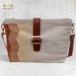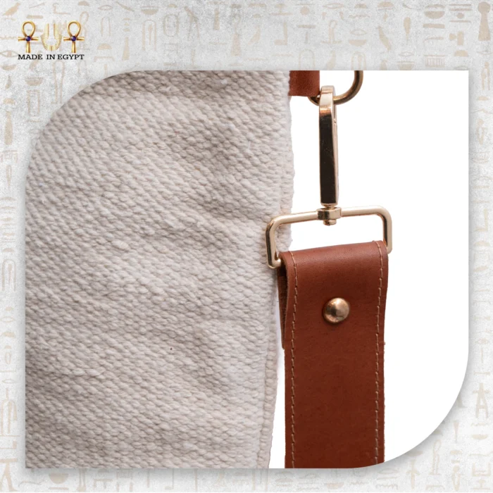 The handbag is accented with a genuine brown leather strap and a polished golden buckle, adding strength and sophistication. In addition, its structured silhouette maintains balance, while the soft cotton body ensures comfort and flexibility. Inside, a smooth cotton lining protects your essentials, and the secure top zipper offers both convenience and peace of mind. The adjustable leather strap allows for versatile wear — crossbody for casual days or shoulder carry for a polished look.