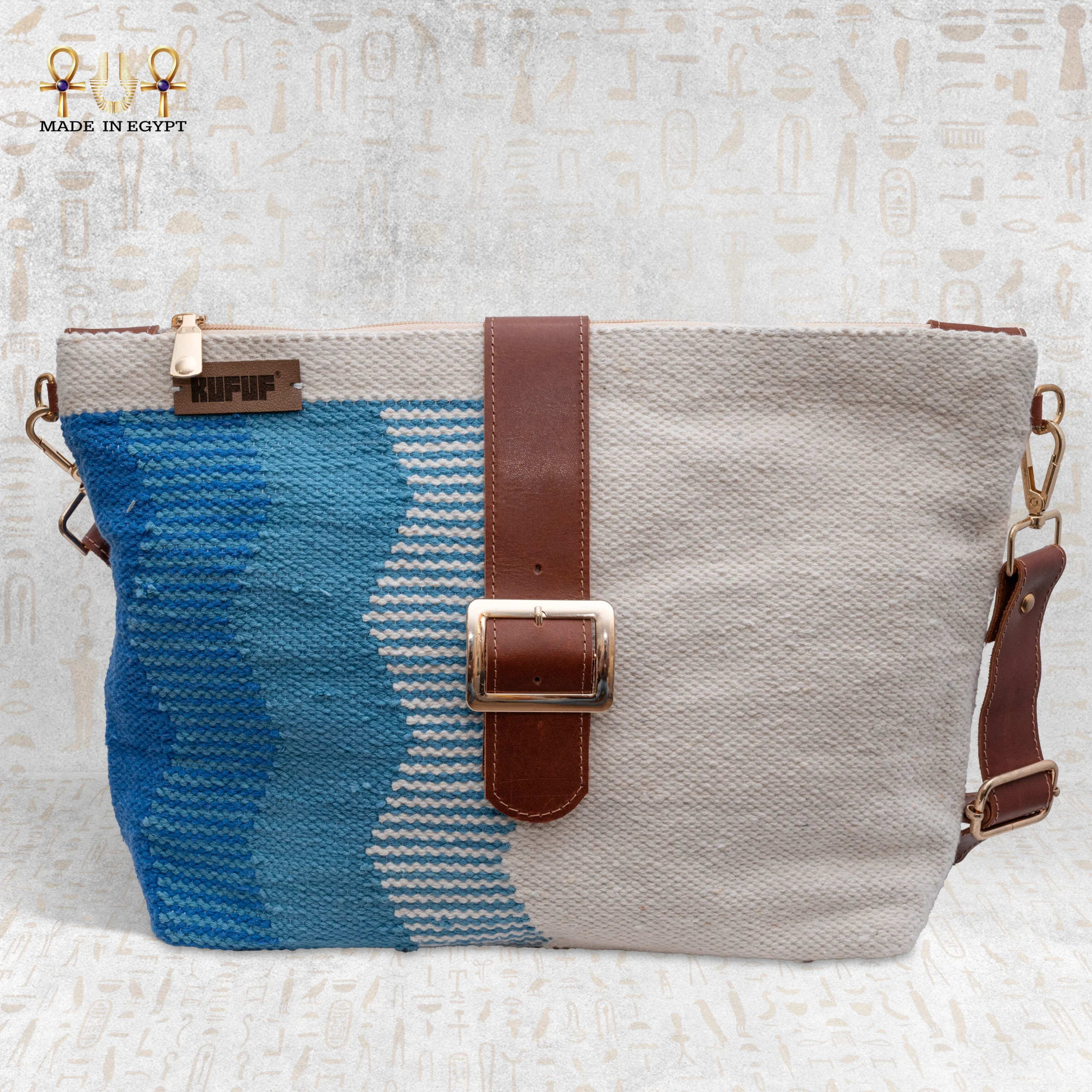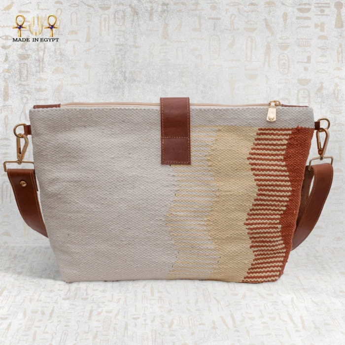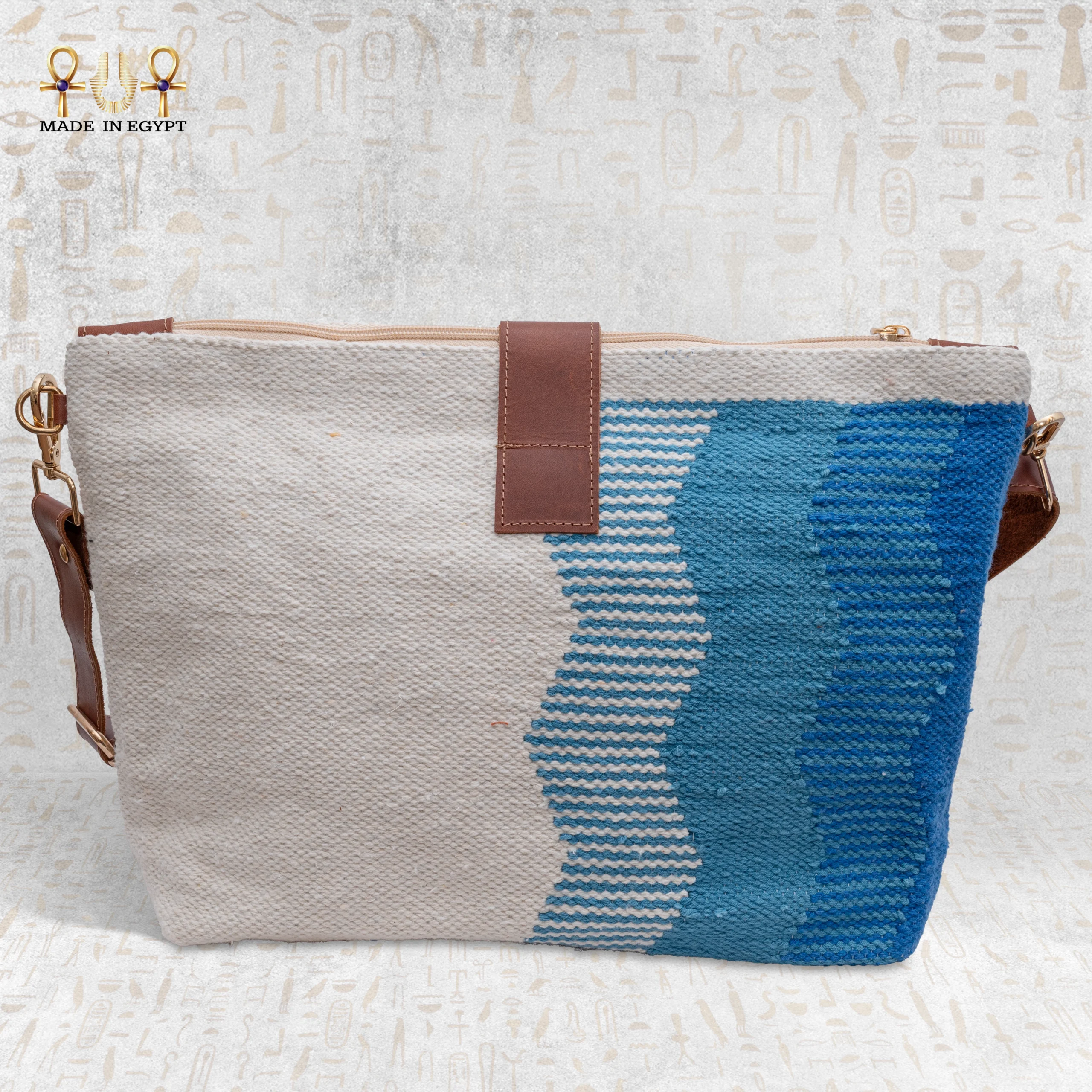 Each Sand Wave Handbag is handcrafted on traditional Egyptian looms using soft, natural cotton threads. Skilled artisans interlace hues of blue, beige, and gold to evoke the harmony between water and sand. Moreover, the fluid wave-like pattern symbolizes connection — between tradition and modernity, between nature and art. Every thread carries a touch of human creativity, transforming raw materials into a refined and elegant texture.