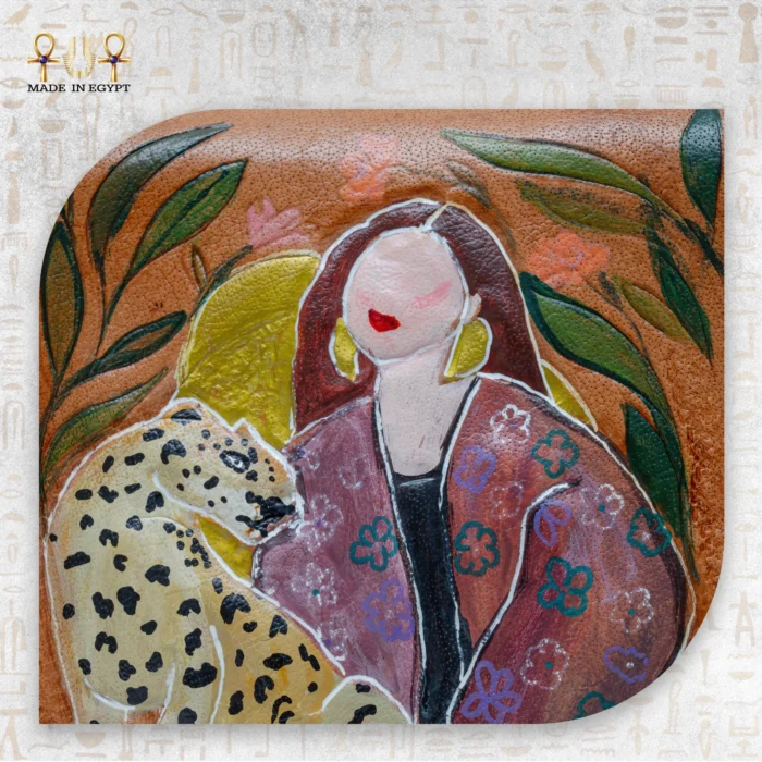 Hand-painted brown leather bag featuring a woman and cheetah motif — elegant, artistic, and proudly made in Egypt.
