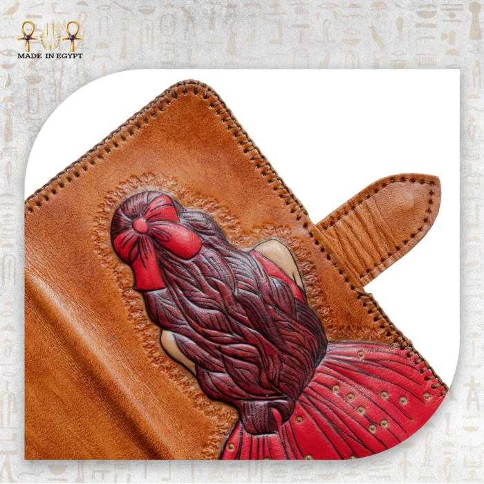 Crafted by skilled Egyptian artisans, each brushstroke tells a story. The red dress expresses power and magnetism, while the delicate braid and bow hint at quiet confidence. Moreover, the blend of color, texture, and emotion transforms this wallet into a wearable masterpiece that reflects both cultural richness and modern elegance.