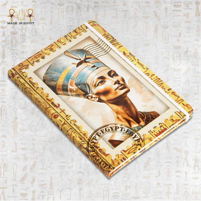 Nefertiti notebook cover with detailed illustration of the Egyptian queen and hieroglyphic frame.