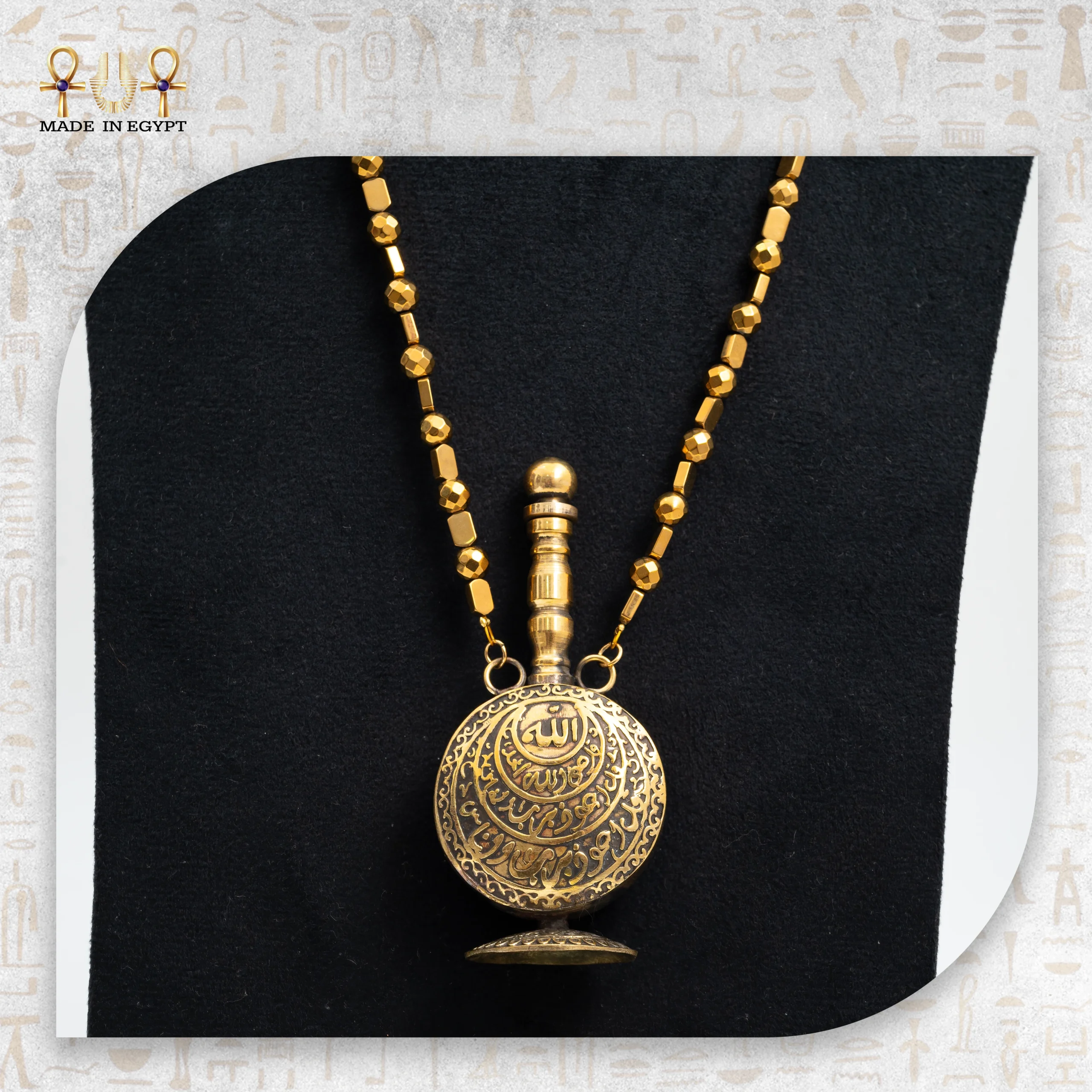 A luxurious hematite necklace featuring a pure brass engraved bottle pendant, usable as a kohl container or portable white musk vial. A unisex piece blending tradition, elegance, and purpose.