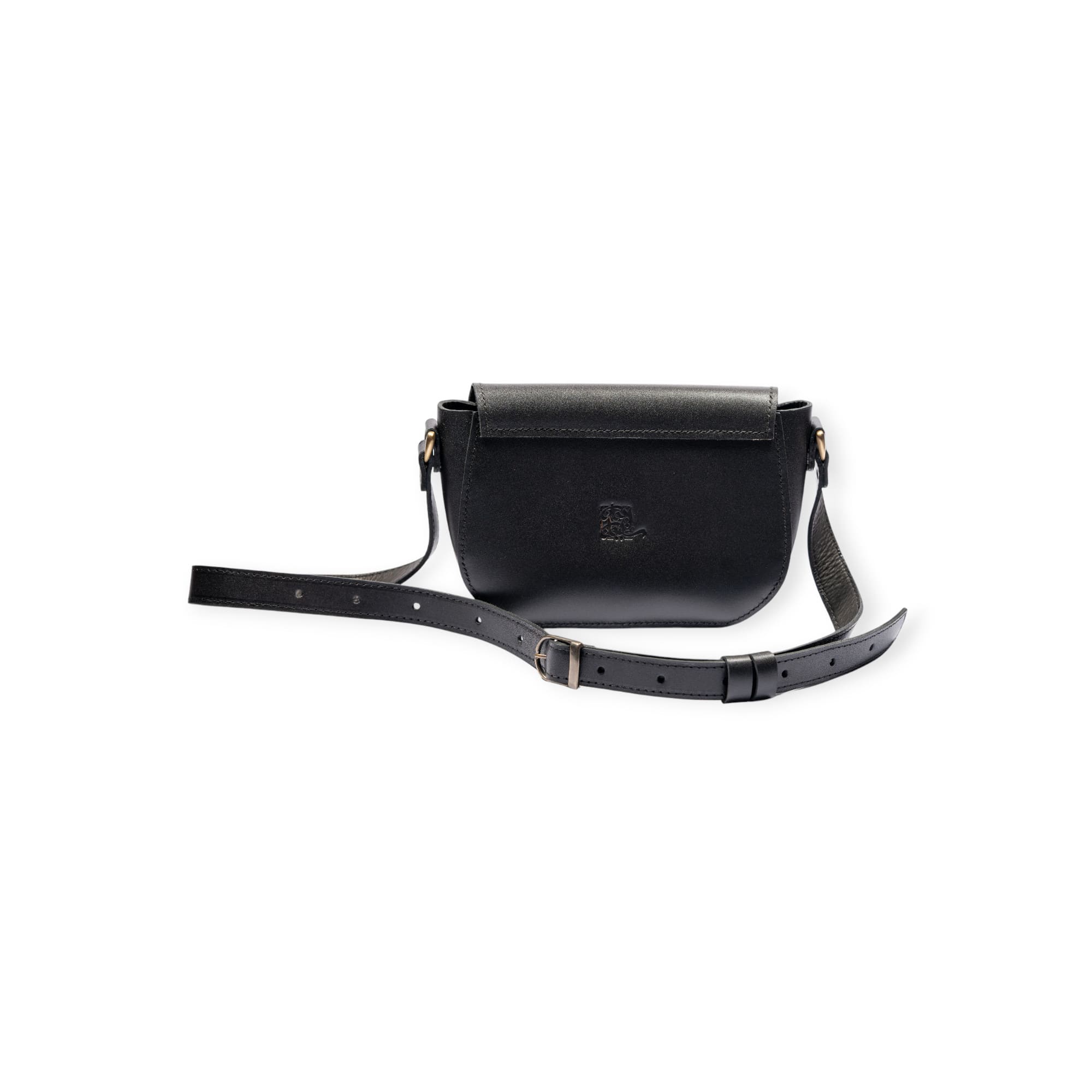 Back view of black small crossbody leather bag with embossed logo and adjustable strap.
