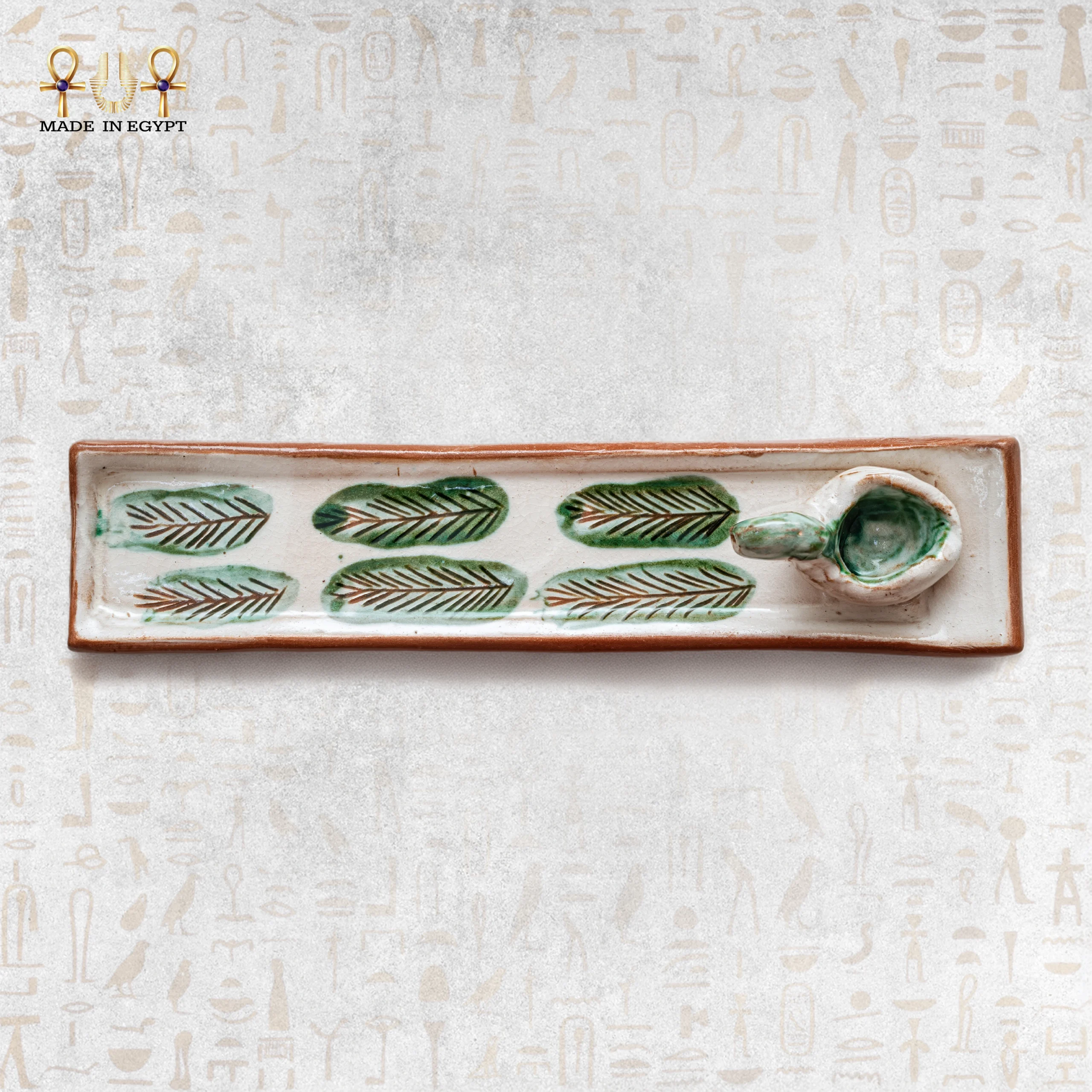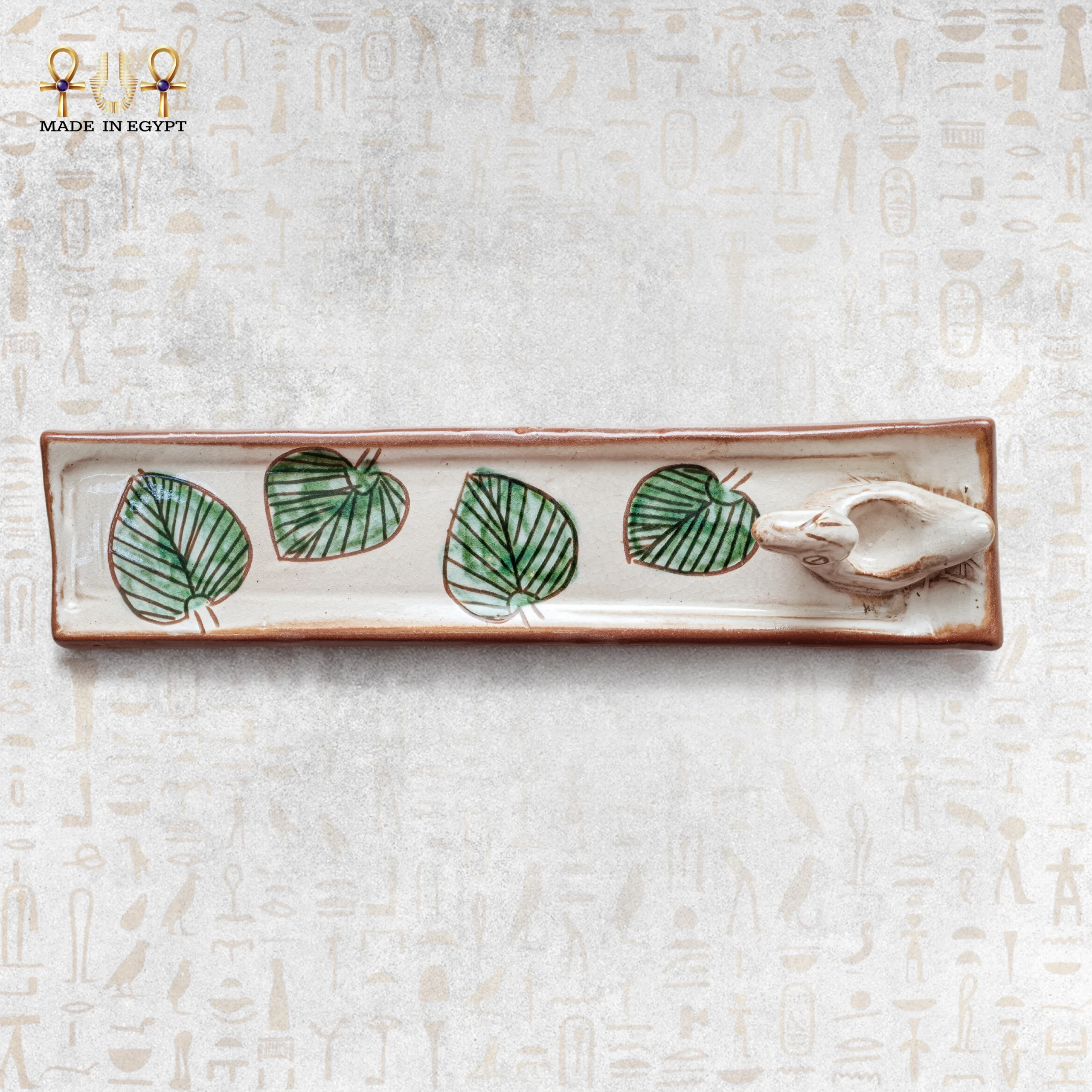 A handcrafted rectangular ceramic stick incense holder decorated with lotus leaves and a sculpted bird detail.