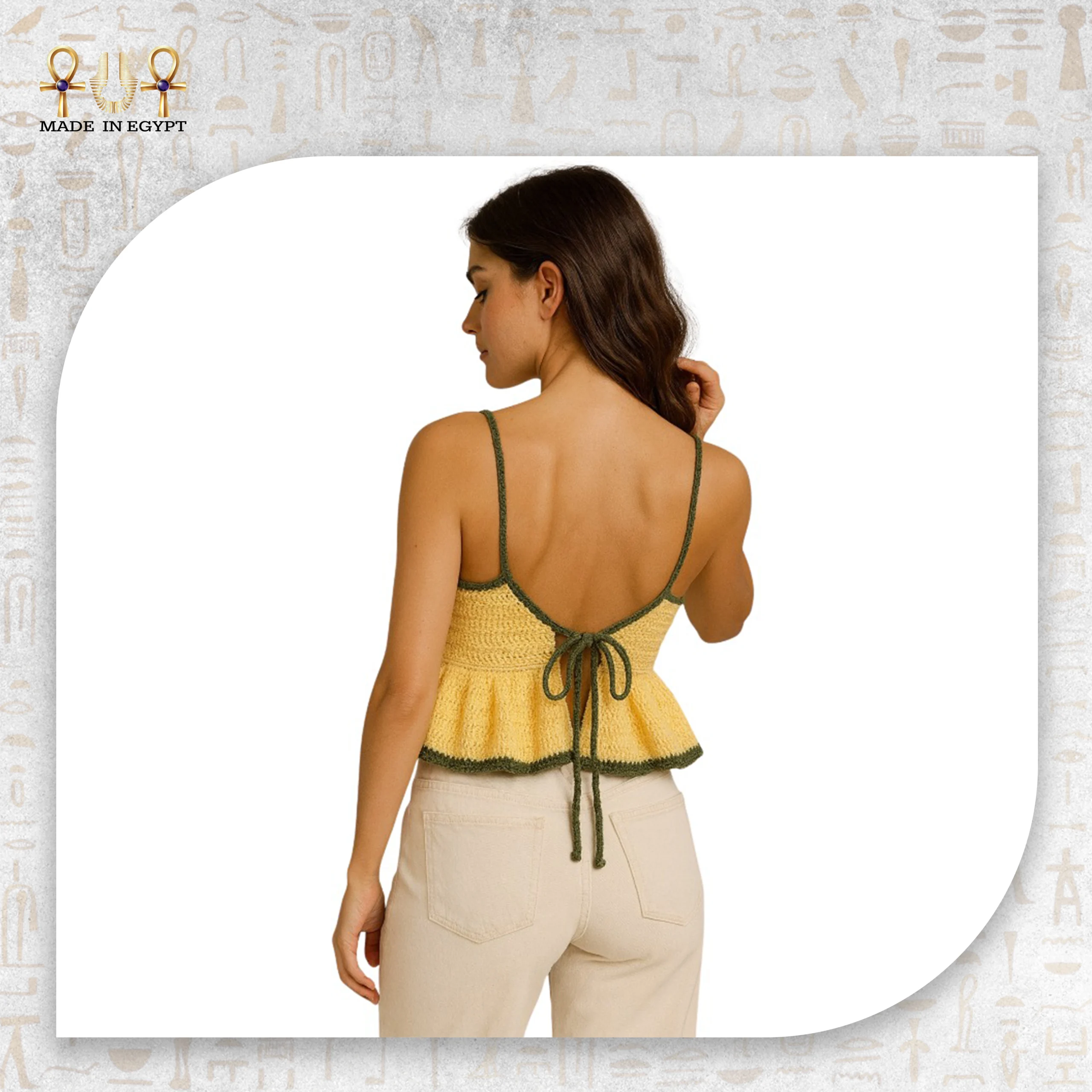 The Sunny Bloom Crochet Top is a true celebration of sunshine and handmade creativity. Carefully crocheted by experienced Egyptian artisans, it combines the warmth of yellow tones with a timeless bohemian design. This top is ideal for carefree days, coastal getaways, and outdoor adventures.