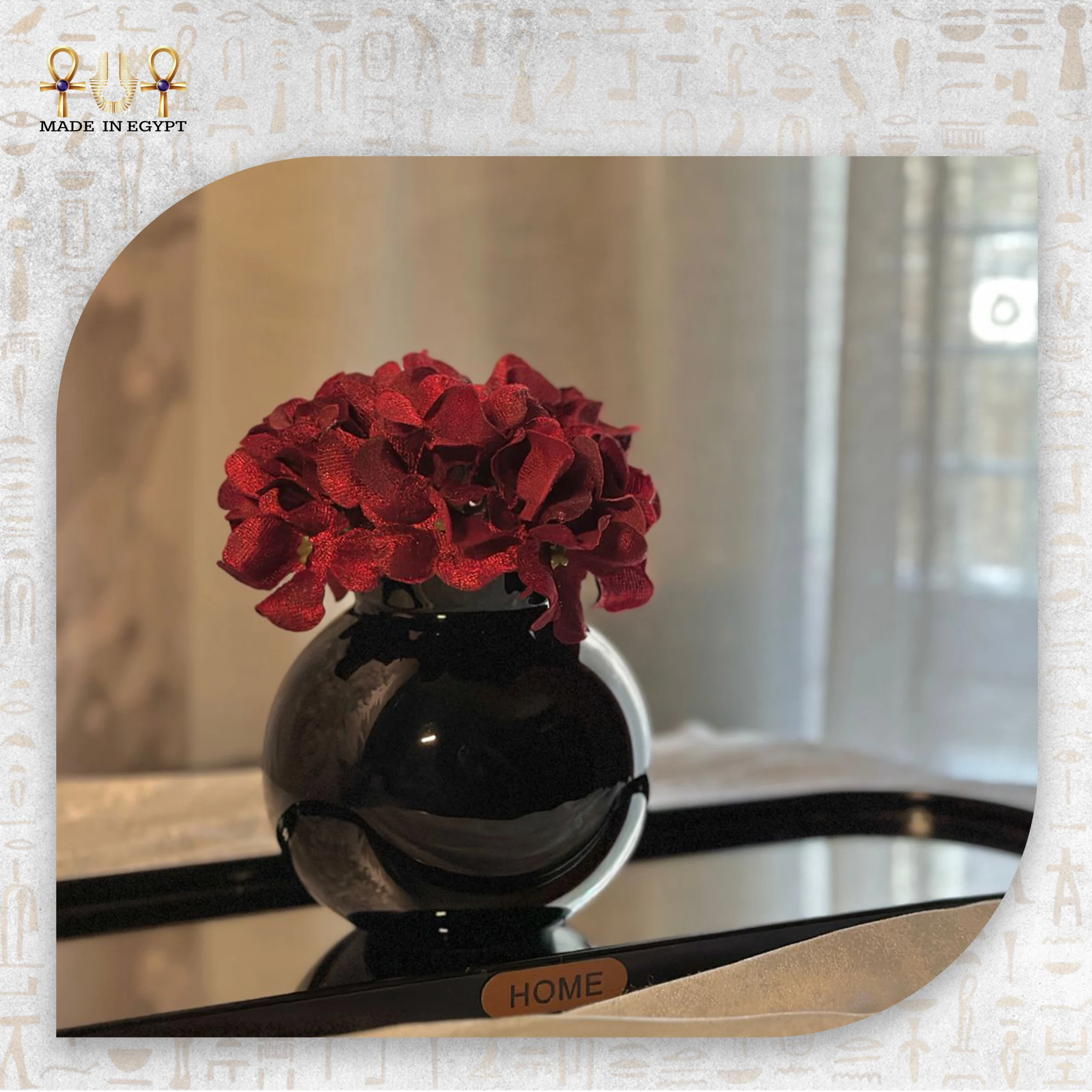 Elegant dark red artificial bloom in a glossy black vase — a perfect accent of warmth and sophistication.