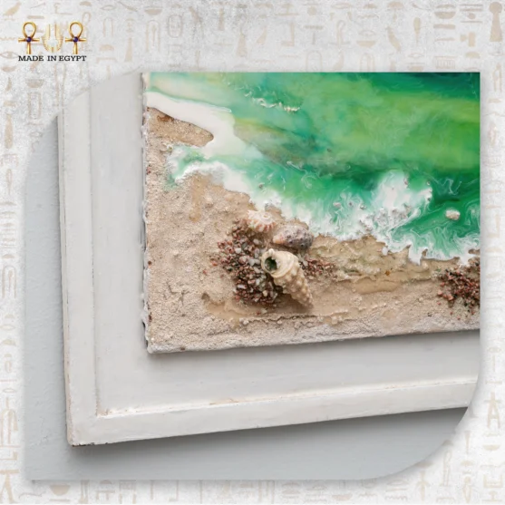 Toward the bottom, the artwork reveals a textured sandy beach crafted with real sand and natural seashells. Here, white foamy wave details meet the shoreline gracefully, creating a smooth and realistic transition between water and land.