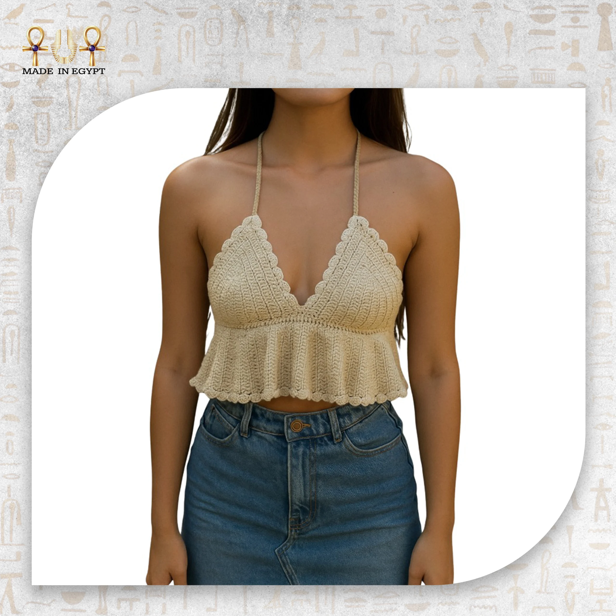 A chic bohemian crochet top with thin straps, a deep V-neck, and a ruffled hem. Lightweight and breathable, perfect for summer days, beach vibes, and free-spirited boho style.