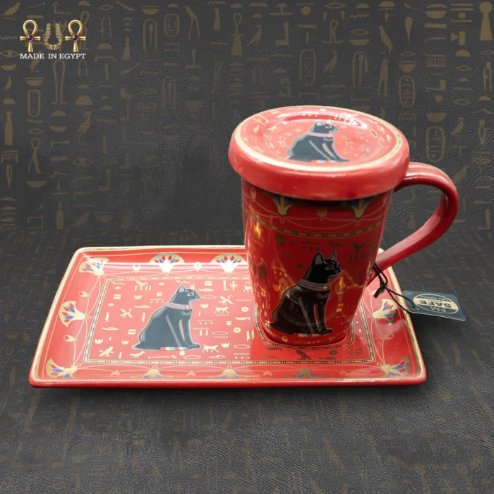 A porcelain mug adorned with Egyptian motifs and the iconic black Egyptian cat, with an insulating layer to ensure the print’s durability.