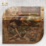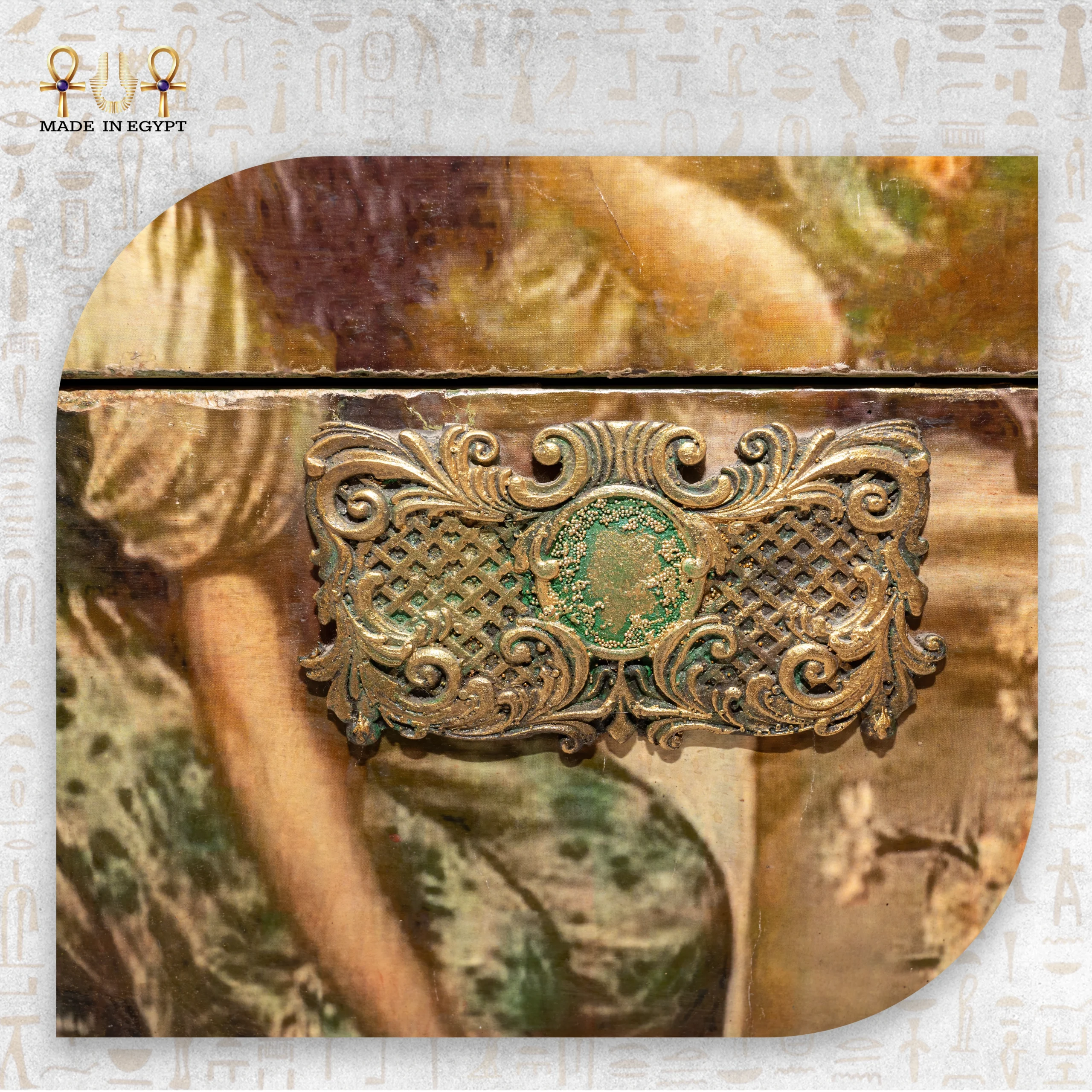 At its center, an enchanting artwork depicts a young girl lost in thought beside a glass vase of flowers—an image that evokes emotion and nostalgia. The ornate golden frames, rivets, and handles add a royal character reminiscent of European palaces. Moreover, the embossed golden motifs along the corners highlight precision and care. Every detail speaks of devotion, transforming this piece from simple décor into a living story of art and beauty.