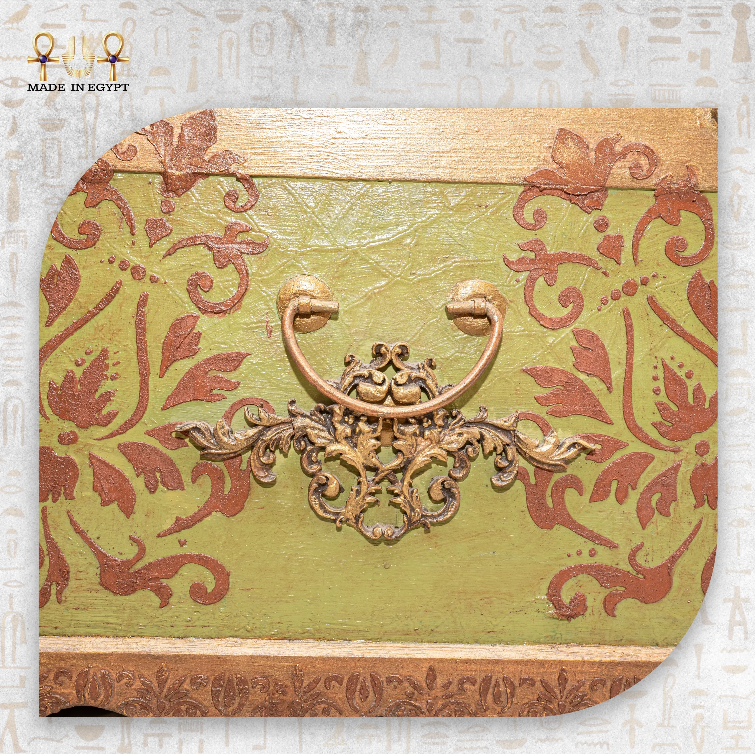 The Golden Tale Chest captures the spirit of Egyptian craftsmanship blended with classic European artistry. It transforms storage into a visual experience of luxury and heritage. Handcrafted from solid wood, it features rich textures created through painting, decoupage, and metallic finishes. As a result, each surface glows with depth and sophistication. The golden engravings flow gracefully over olive-green and bronze tones, forming a balanced harmony of brilliance and serenity.