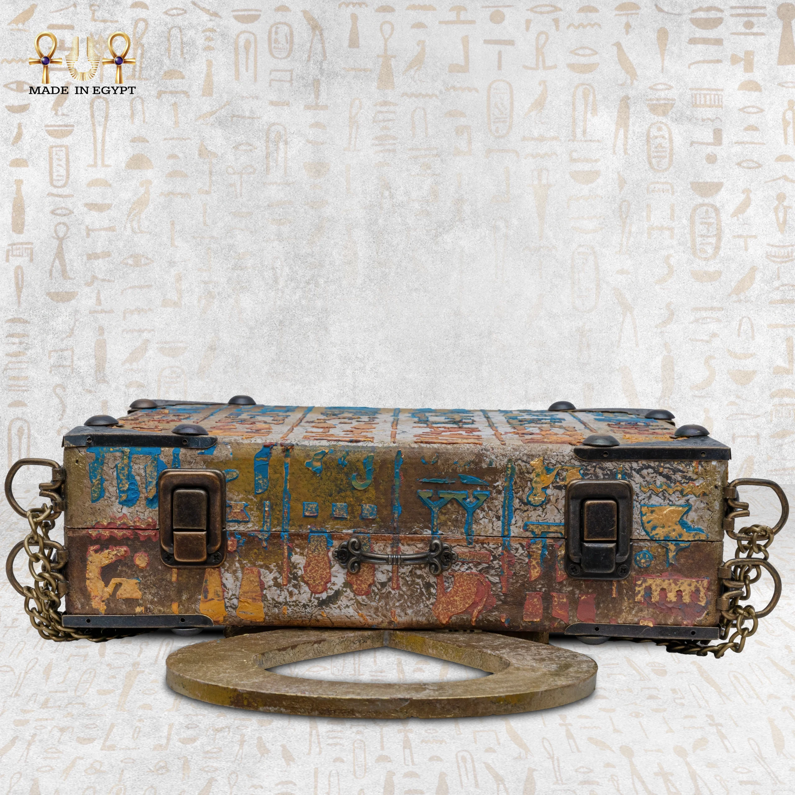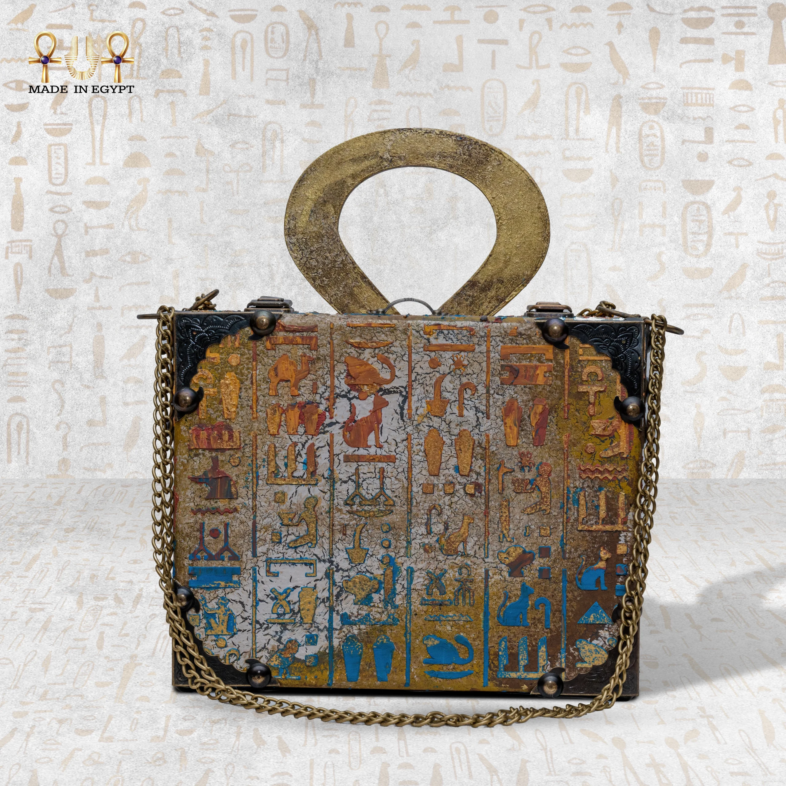 A luxurious handmade wooden bag with a pharaonic design, featuring the Key of Life and embossed hieroglyphic carvings.