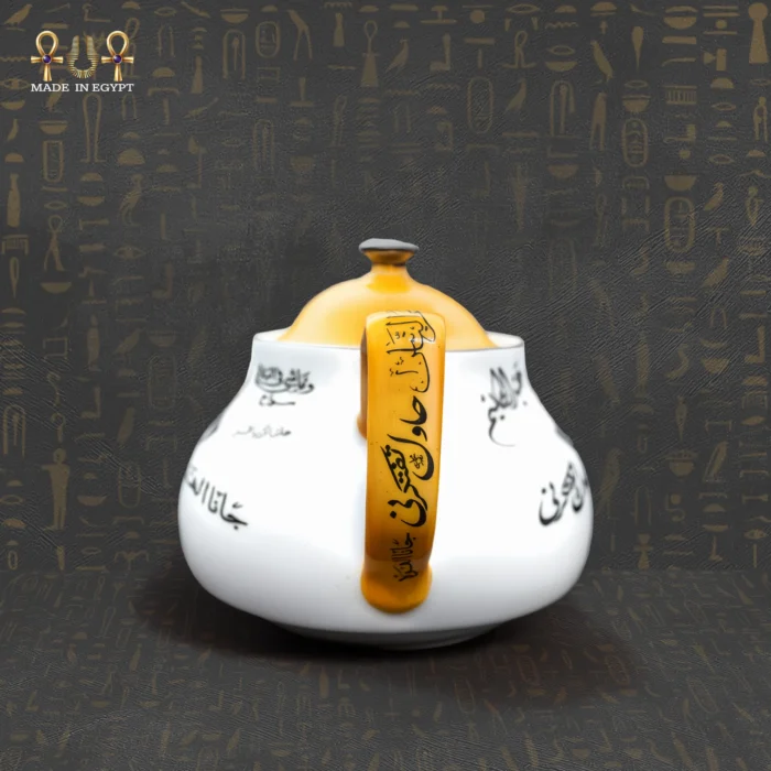 The Nightingale Teapot features a beautifully etched portrait of Abdel Halim Hafez, complemented by the lyrics of his famous songs such as “Gana El-Hawa” and “Hawwa Shouqan”. Each detail is carefully hand-applied and protected by a special layer to prevent peeling, ensuring that the design remains vibrant and intact for years. Additionally, the teapot’s bright white porcelain and subtle golden accents enhance its aesthetic appeal, making it a striking decorative piece in any setting.
