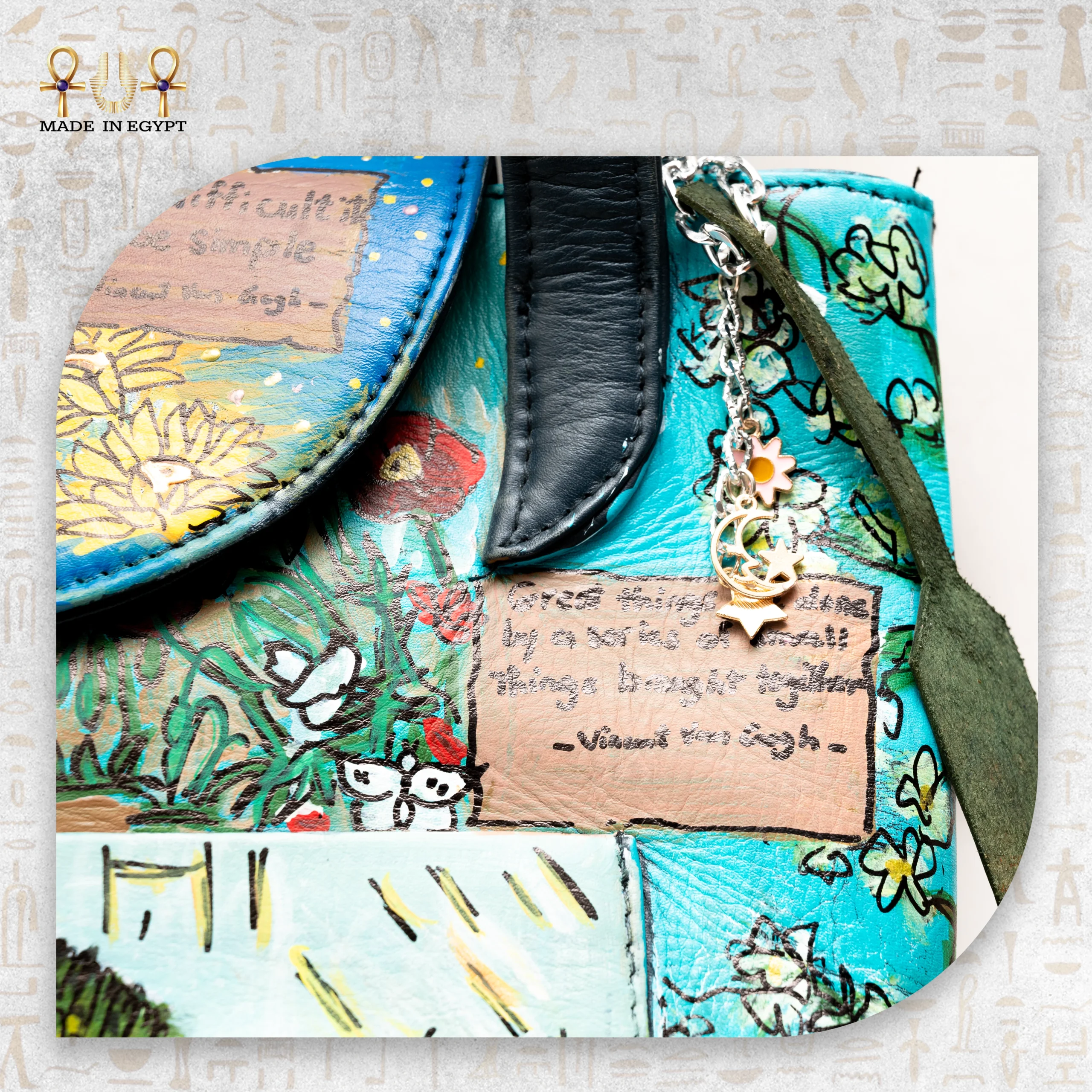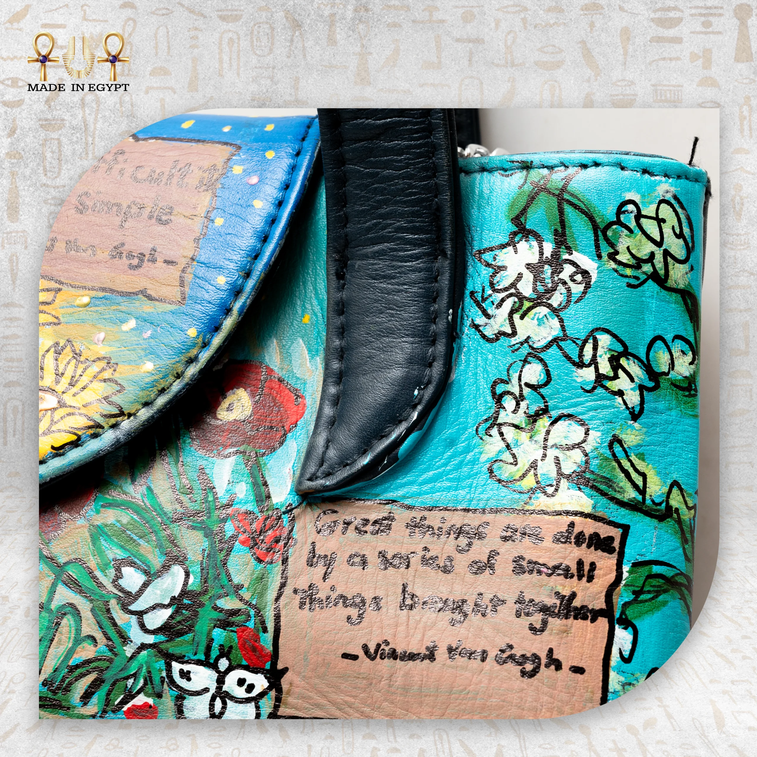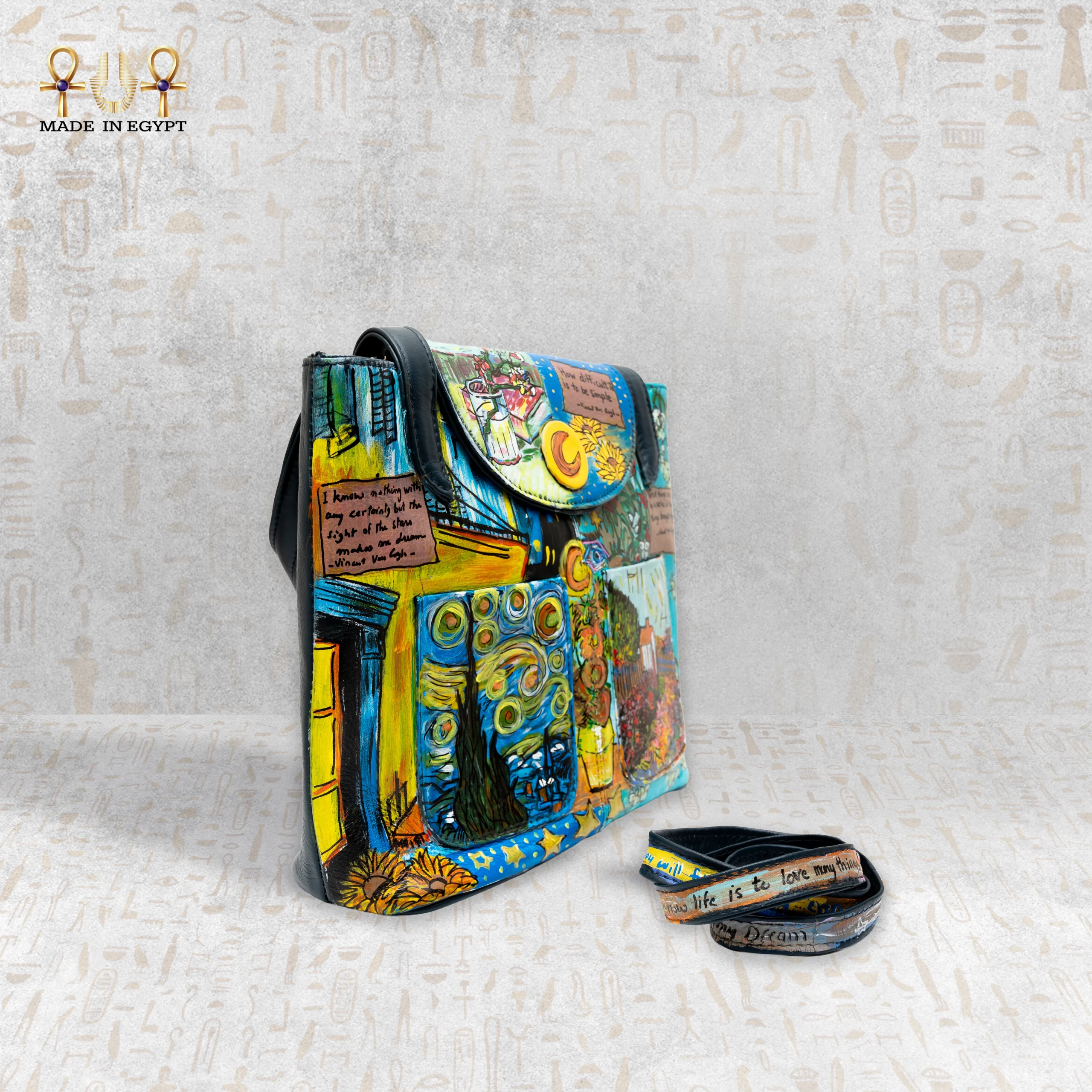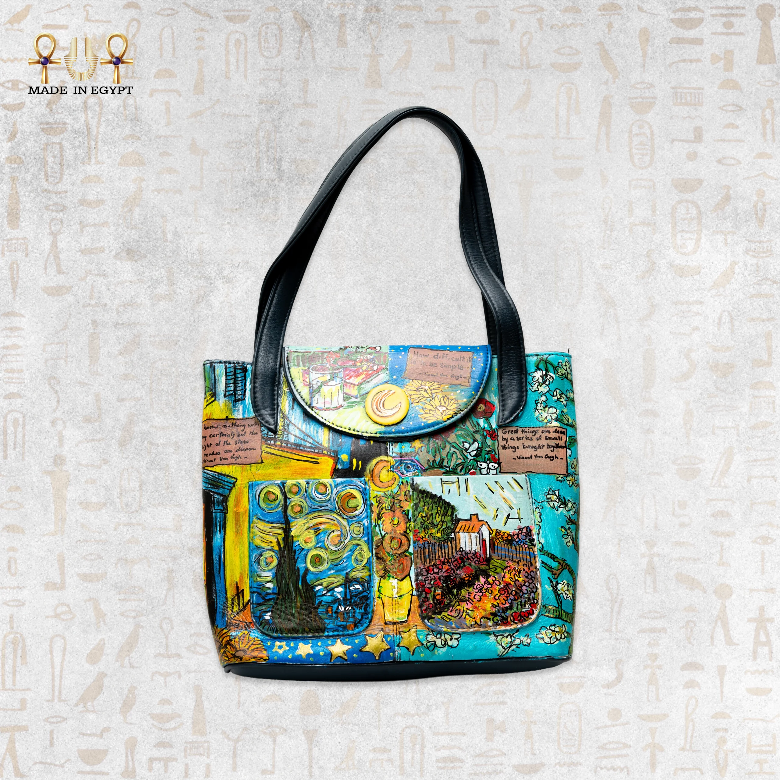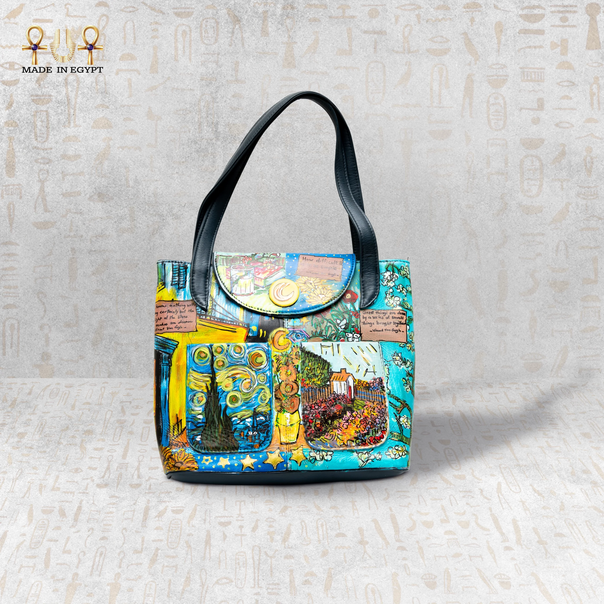 Artists hand-paint every bag with expressive brush strokes and vibrant colors. The artwork reflects swirling stars, blooming flowers, and dreamy landscapes inspired by impressionist art. Golden accents add warmth and contrast to the deep blue background. Because artists paint every detail by hand, each bag becomes truly one of a kind.