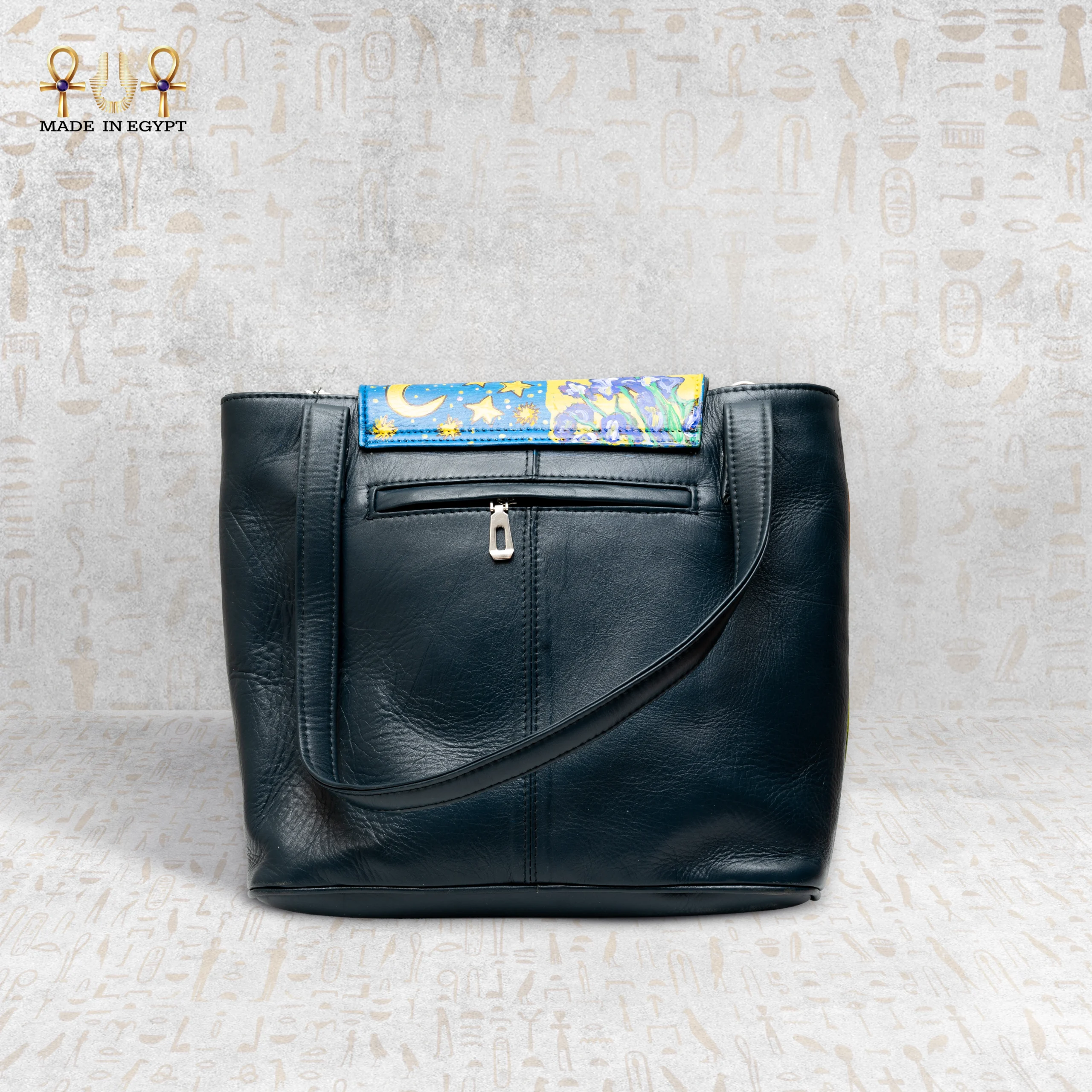 A fully hand-painted genuine leather handbag in deep blue, inspired by the magic of starry skies.