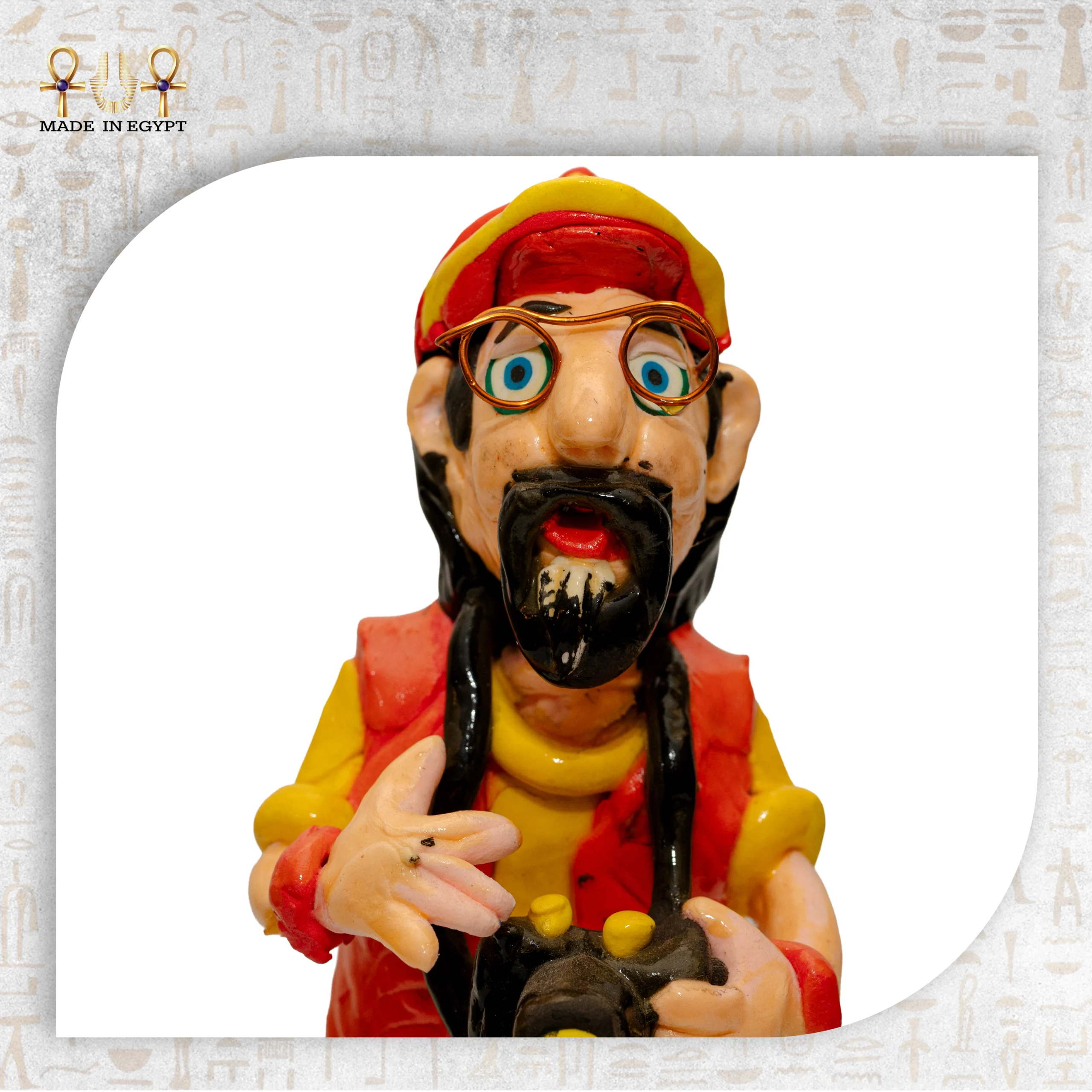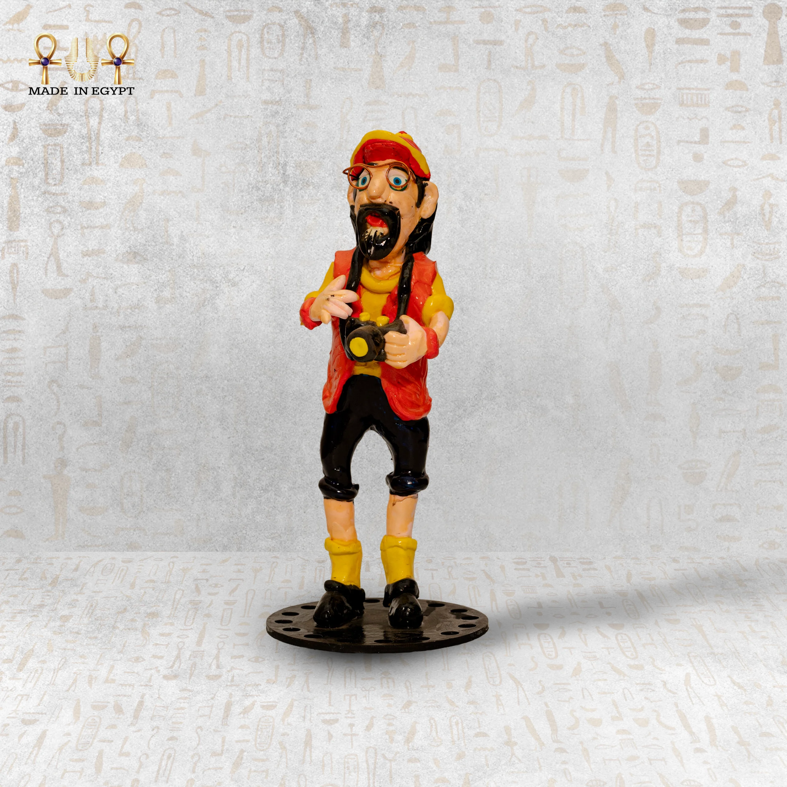 A handmade artistic figurine depicting a tourist holding a camera, crafted from foam clay and paper dough. A cheerful décor piece inspired by travel and exploration.