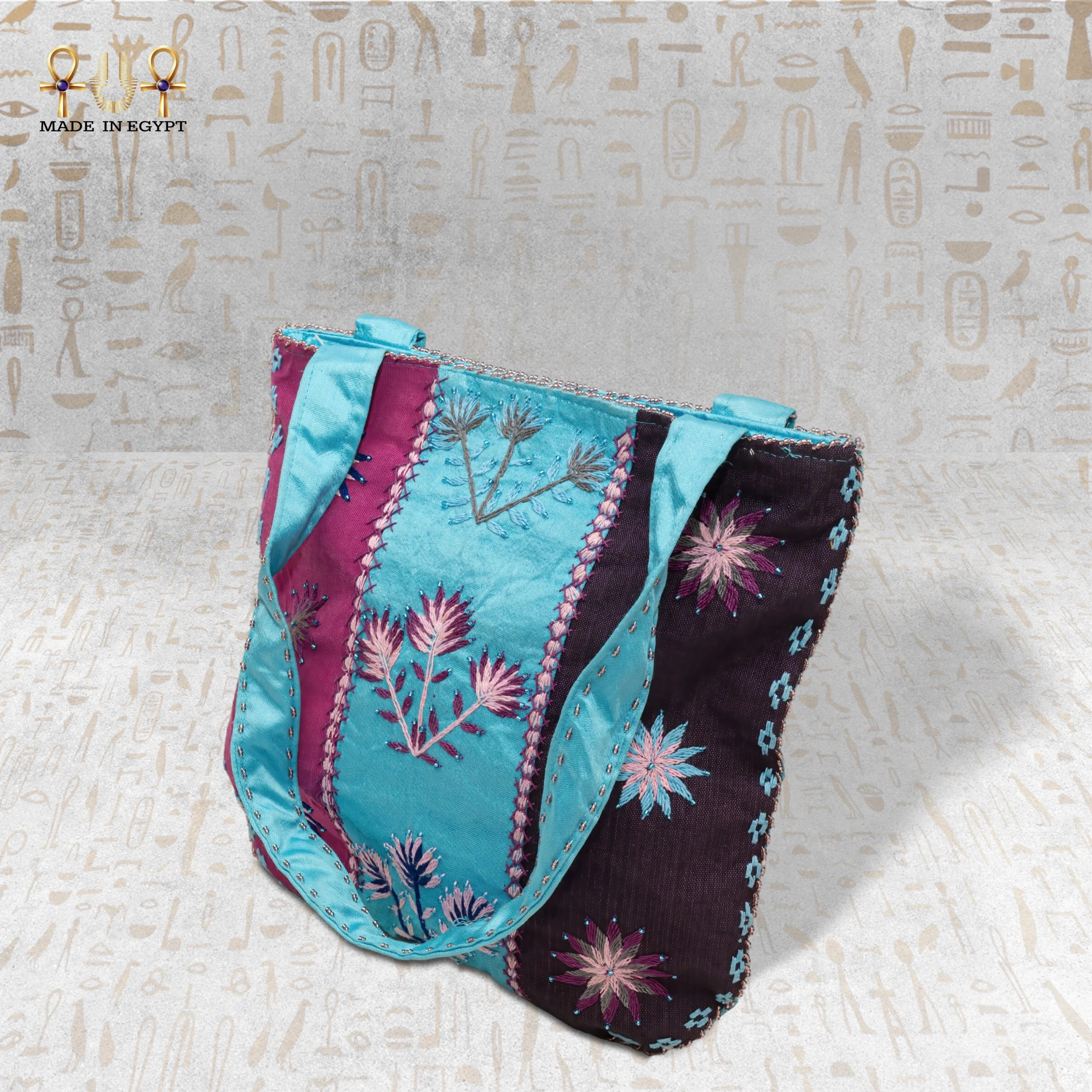 The design features three complementary colors: warm purple, bright turquoise blue, and elegant black. Together, they create a visually striking balance. The front panel showcases detailed handmade embroidery of flowers and plant branches. Shiny threads in pink, purple, blue, and silver add depth and vibrancy. At the center, a large multi-petal flower anchors the design, surrounded by delicate nature-inspired motifs. Even the fabric handles display fine embroidery, reflecting careful attention to detail.