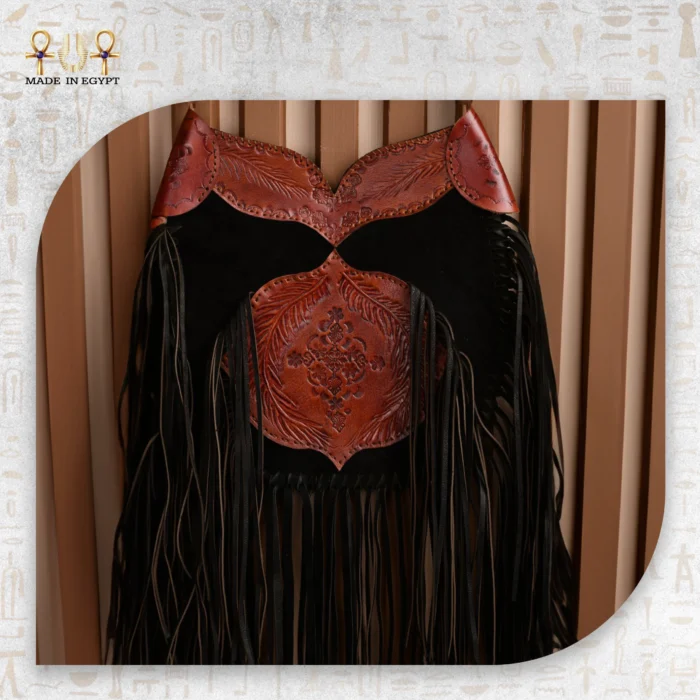 A bohemian-inspired handmade leather fringe bag, crafted from genuine cowhide and suede leather, featuring full hand-carved detailing, natural goat leather lining, and extra-long leather fringes for a bold, artistic look.