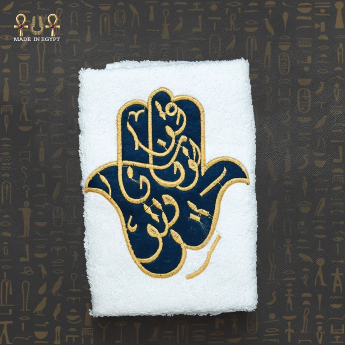 Each towel in the Touch of Protection set is beautifully embroidered with the iconic “Hand of Protection,” a symbol renowned for safeguarding against the evil eye and misfortune. The embroidery is handmade, reflecting the rich Arabic folk heritage, and adds authenticity and charm to every piece. Furthermore, the meticulous craftsmanship ensures that the design remains vibrant and detailed, creating a towel that is both elegant and meaningful.