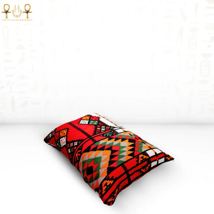 The cushion’s striking color palette — fiery red, palm green, warm orange, and soft beige — captures the soul of Egypt’s deserts and villages. Its geometric motifs echo the timeless patterns of traditional kilim weaving. Every design tells a story of the desert’s vast beauty, the calm of palm trees, and the welcoming spirit of Egyptian hospitality.