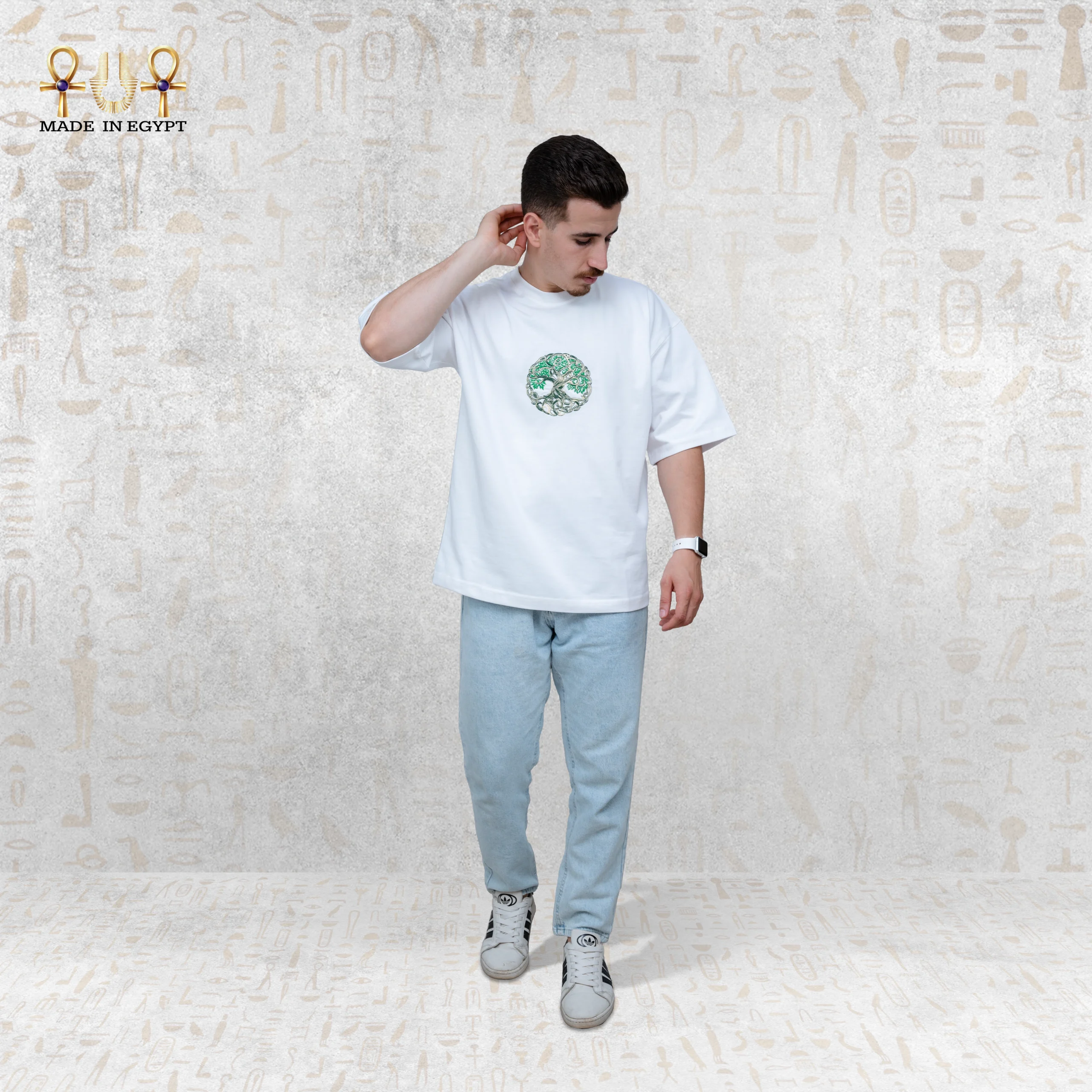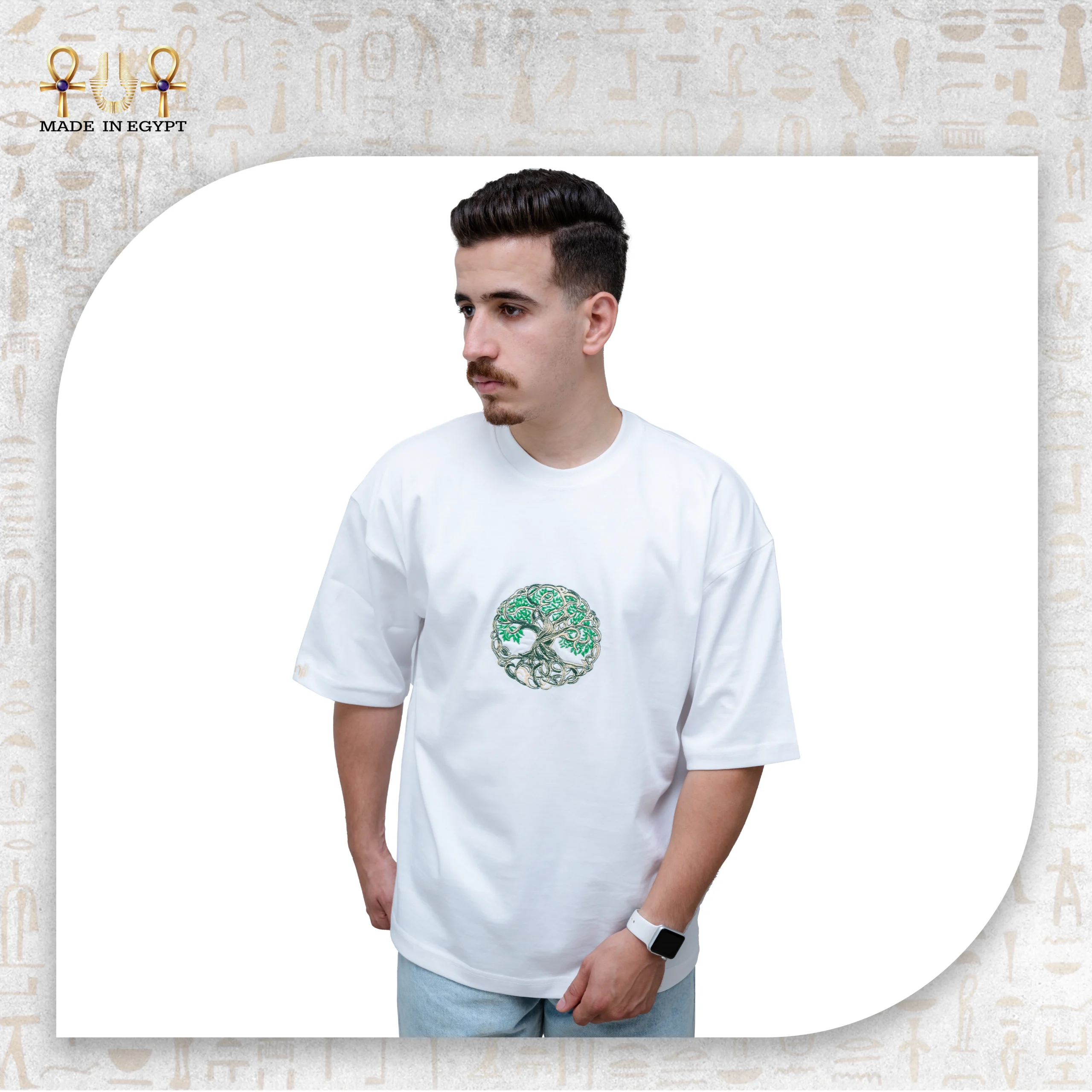 The front embroidery features the iconic Tree of Life symbol, meticulously stitched in soothing green and white tones. Each thread represents growth, connection, and the beauty of living in harmony with nature. Moreover, this detailed embroidery reflects the skill of Egyptian artisans, transforming the T-shirt into a piece of wearable art.