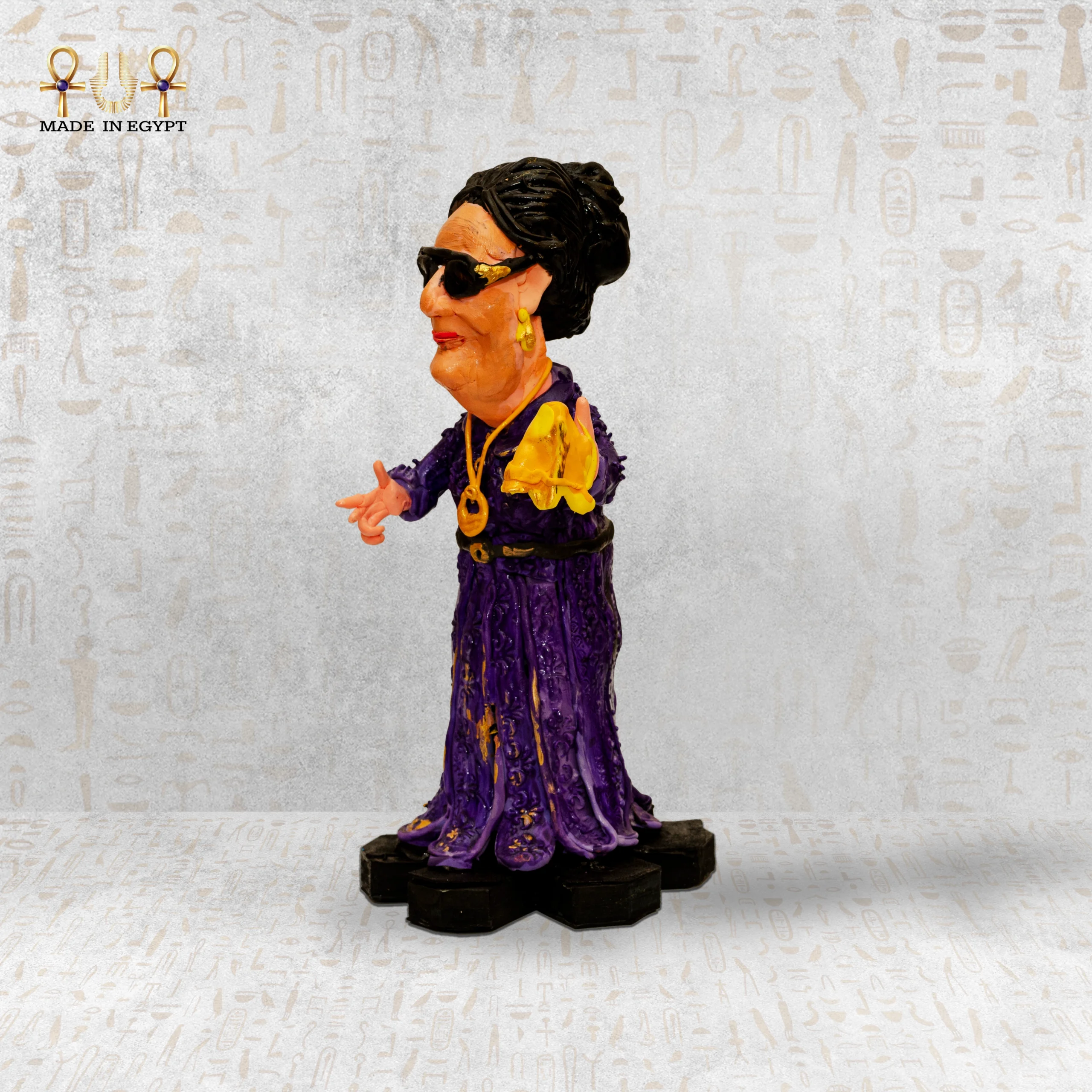 The Umm Kulthum Figurine represents one of the most iconic figures in Arab music history, celebrating the legendary singer’s powerful presence and timeless influence. Designed in a contemporary artistic style, the figurine reflects elegance, confidence, and cultural pride. She is depicted wearing a rich purple gown, a color long associated with sophistication and prestige, along with her signature black sunglasses that became an essential part of her iconic image.