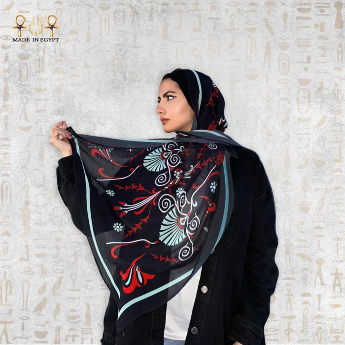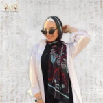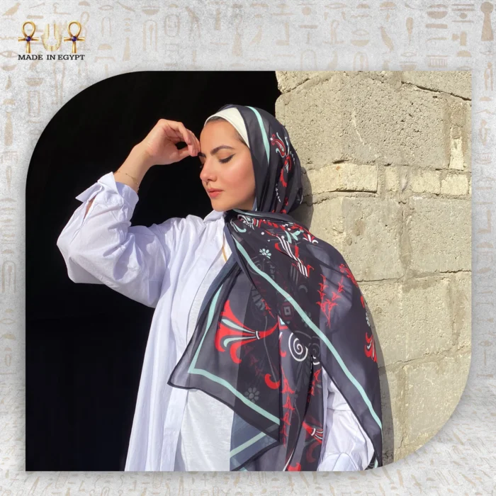 The beauty of Valantina lies in its refined balance of color and pattern. Inspired by nature, its artistic motifs blend harmoniously into a luxurious, modern design. Bold shades of black, red, and light blue create contrast and visual depth, adding a vibrant touch that enhances any outfit. The geometric and organic lines flow together effortlessly, making each fold and wrap look naturally elegant.