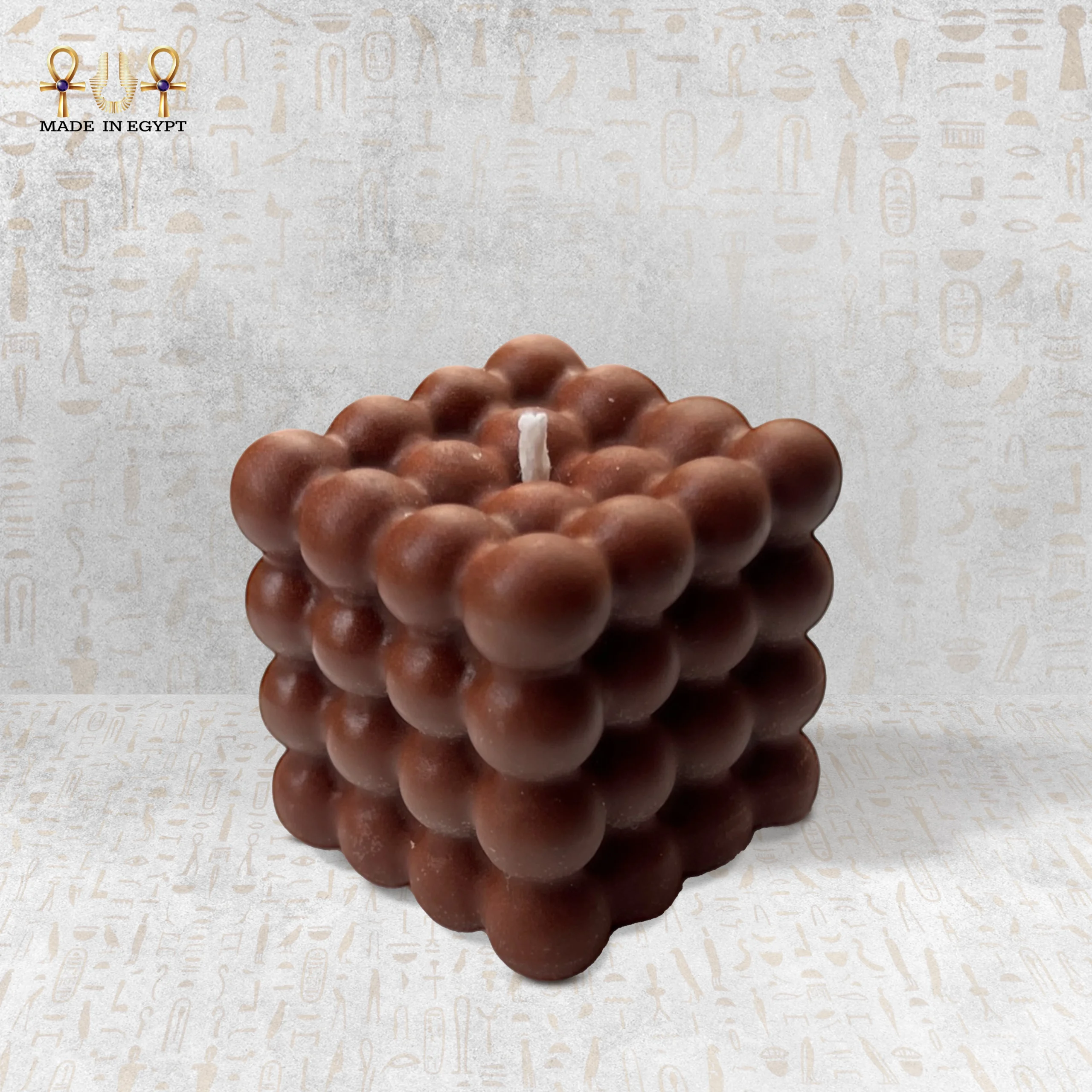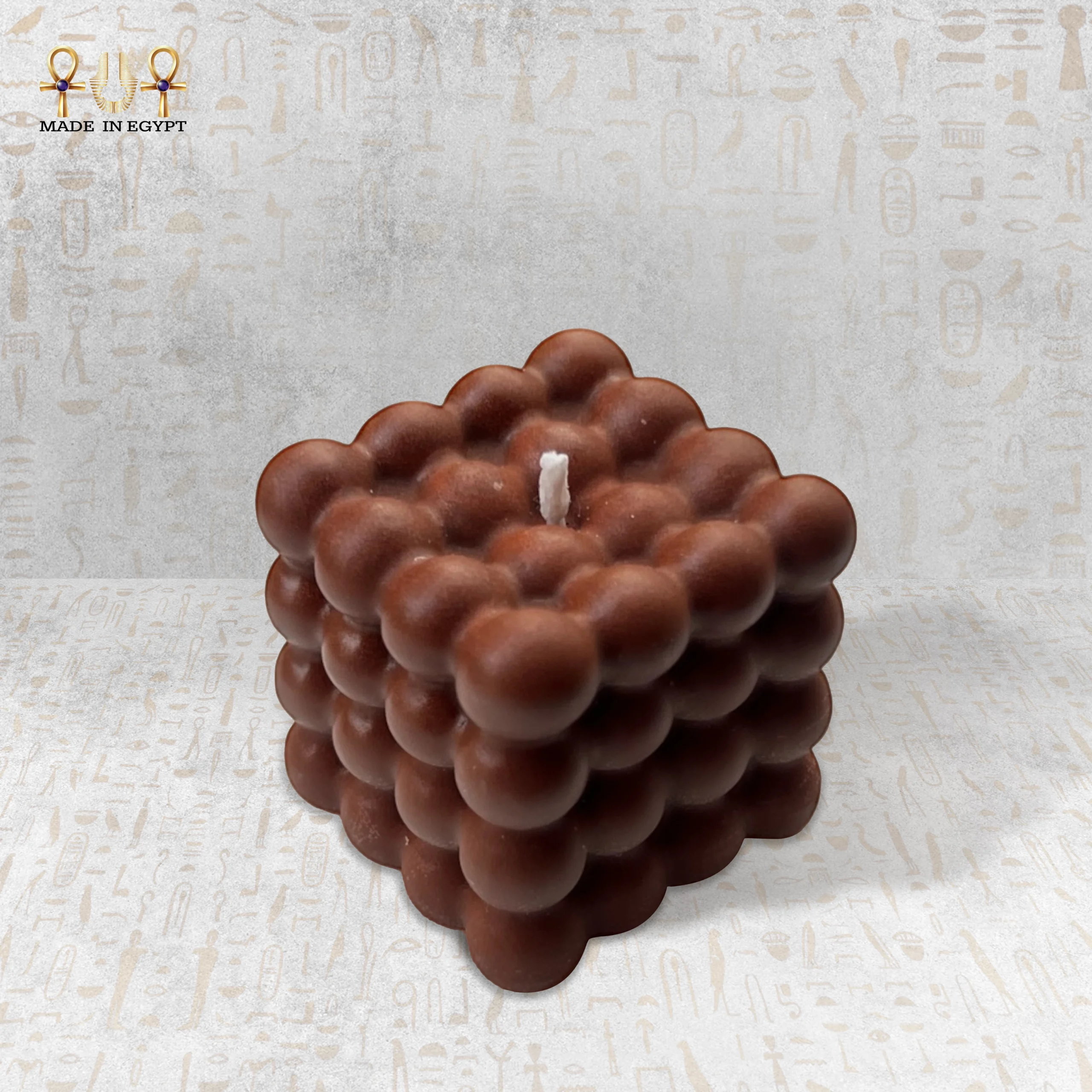 The candle comes in a modern and elegant geometric design, with detailed textures that add a stylish decorative touch. Its warm color reflects the essence of its fragrance, enhancing the overall feeling of comfort and harmony within the space.