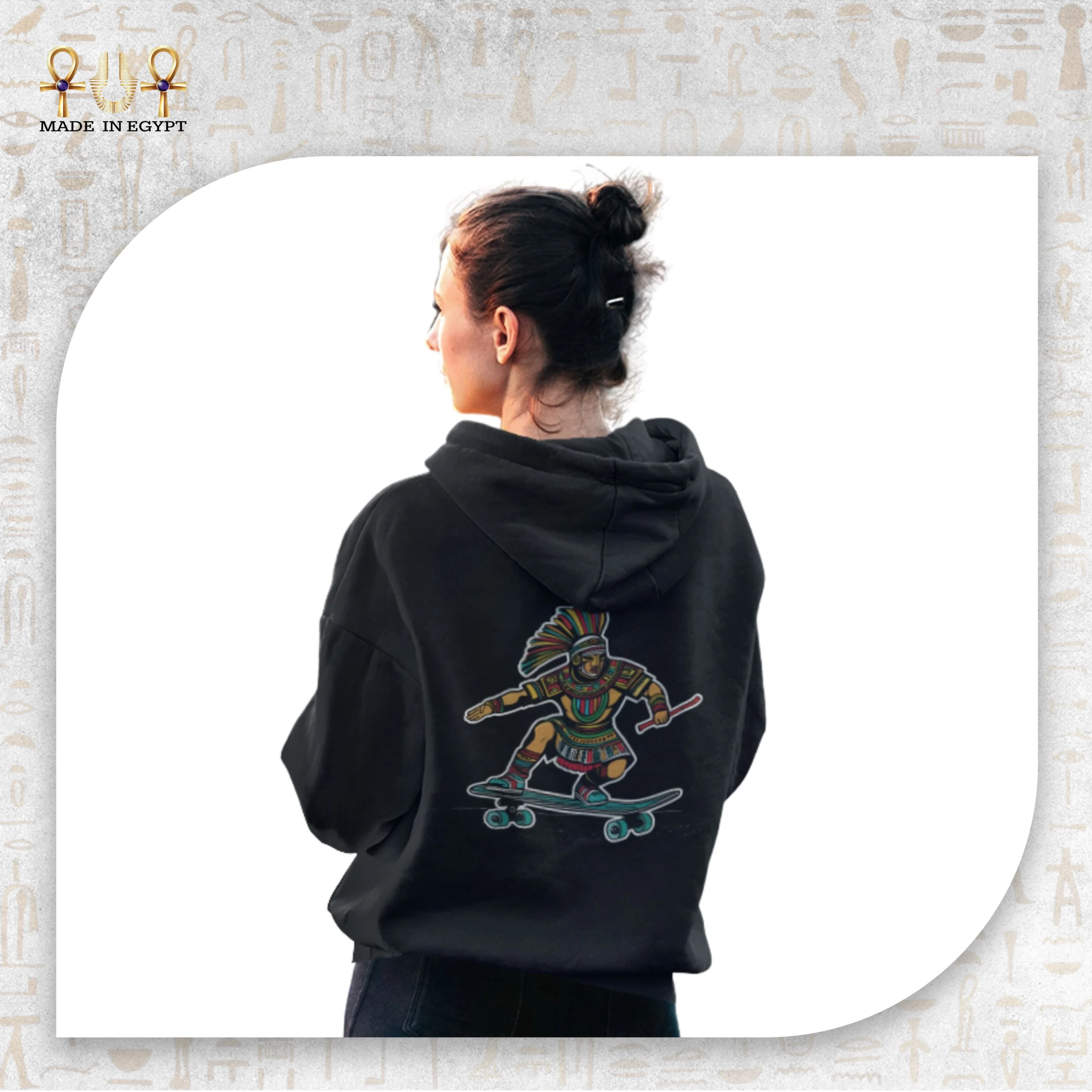 The back design is a lively scene: a traditional warrior riding a skateboard with poise and power. It’s a visual metaphor for evolution — staying rooted in culture while spinning toward the future with boldness and freedom. In one motion, it merges history with youth culture.