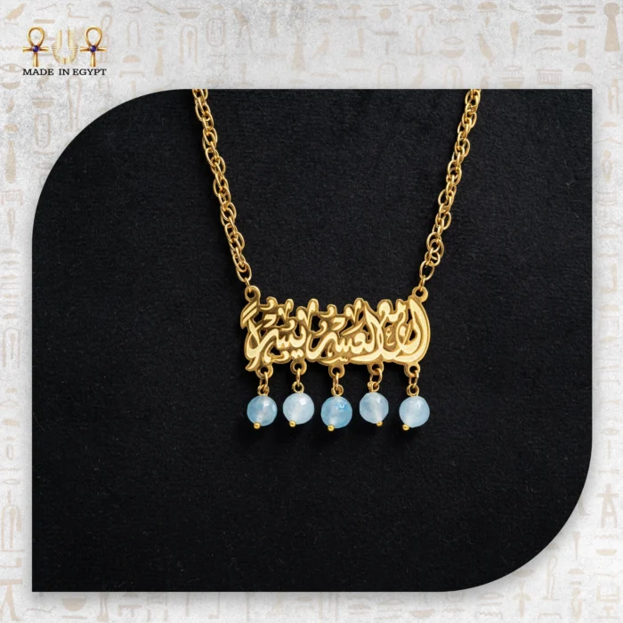 A stainless-steel necklace featuring a gold-plated brass Arabic calligraphy pendant adorned with light aqua blue agate stones for a soft, elegant, and calming look.
